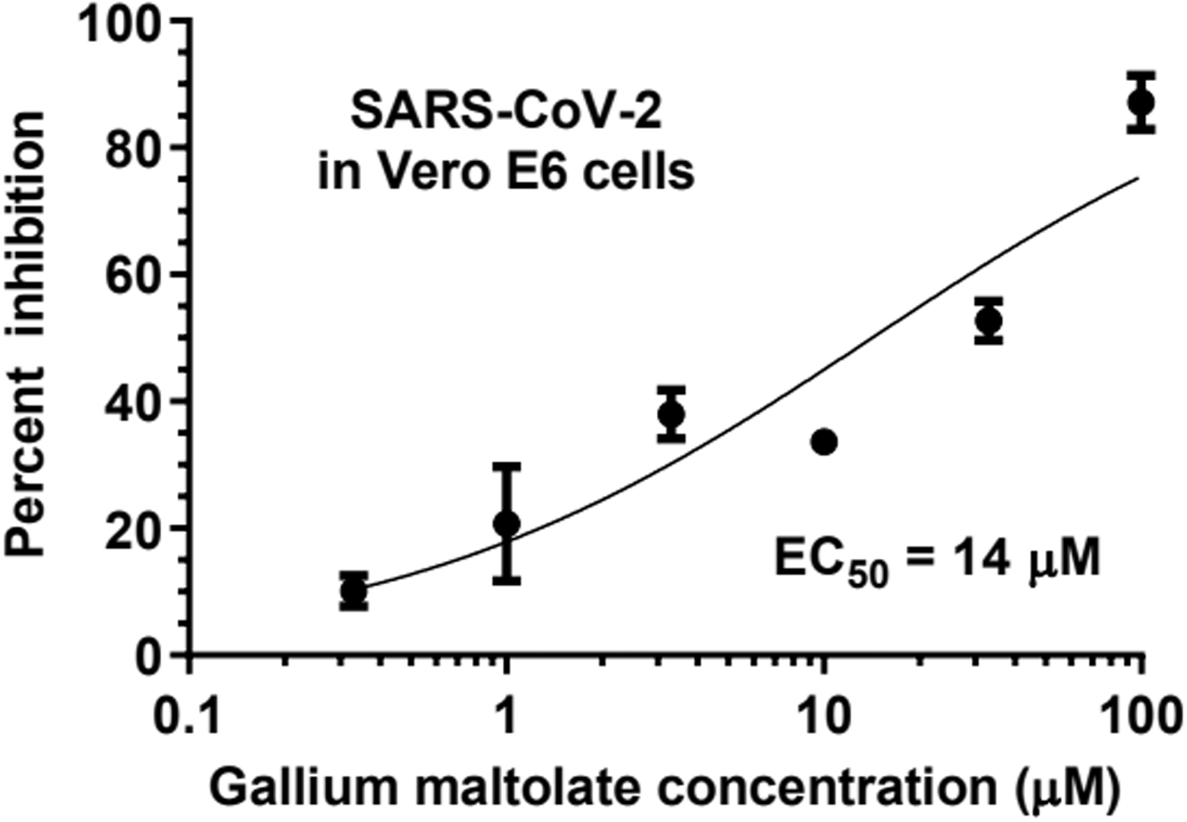 Inhibition of SARS-CoV-2 replication in Vero E6 cells by gallium maltolate at several concentrations.