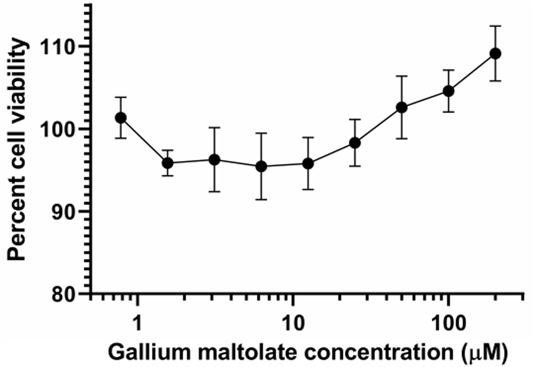 Viability of Vero E6 cells at several concentrations of gallium maltolate.