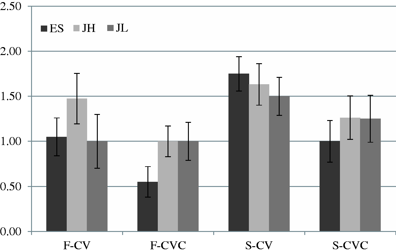 Each participant listened to the target words under four conditions. The duration of target syllables was subtracted from the response time (RT) for analysis. Figure 1 shows RT for the four conditions in the three groups. The mean numbers of errors (ERR) was also counted. Figure 2 shows ERR when the participants were given four target words. Two-way repeated measures ANOVA was performed for RT and ERR in the three groups. The esults for ES indicated significant effects of stress and phonotactics both in RT, stress: Mean responses times in the three groups are shown. F indicates target words with stress on the first syllables and S indicates target words with stress on the second syllables. ES: English speakers, JH: Japanese speakers with high proficiency of English, JL: Japanese speakers with low proficiency of English; CVC: consonant–vowel–consonant; CV: consonant–vowel. Mean numbers of errors in the three groups are shown. F indicates target words with stress on the first syllables and S indicates target words with stress on the second syllables. ES: English speakers, JH: Japanese speakers with high proficiency of English, JL: Japanese speakers with low proficiency of English; CVC: consonant–vowel–consonant; CV: consonant–vowel.