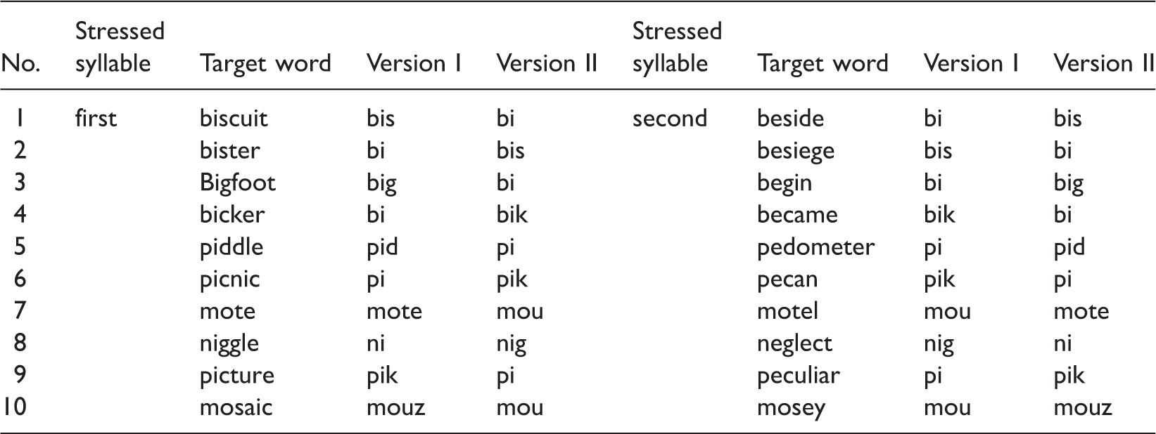 Twenty bisyllabic or trisyllabic words with target syllables (CVC or CV) were selected as target words (see Table 1). Half of them have stress on the first syllables, and the others have stress on the second syllables. Thus, stimuli under the following four conditions were created.