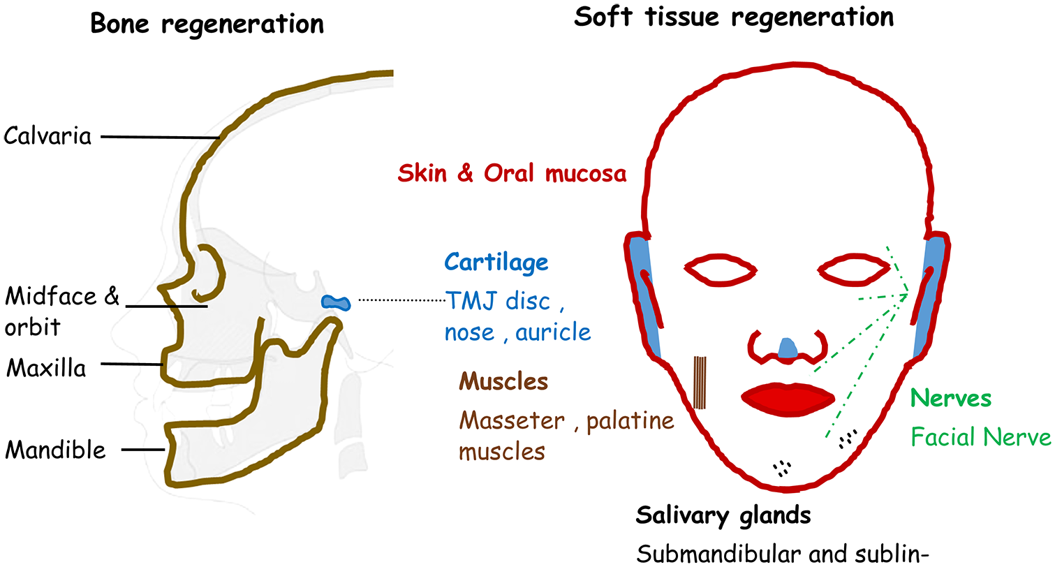 The craniofacial region is a complex network of several tissue types, including bone, cartilage, muscle, salivary glands, nerve tissue, teeth and the surrounding periodontium, and skin/mucosa. The loss of craniofacial tissue may be due to congenital causes, such as clefting 1 and craniofacial microsomia, or acquired conditions, such as facial trauma or tumor resection. The result of this loss is significant aesthetic, functional, and psychological affliction. 2