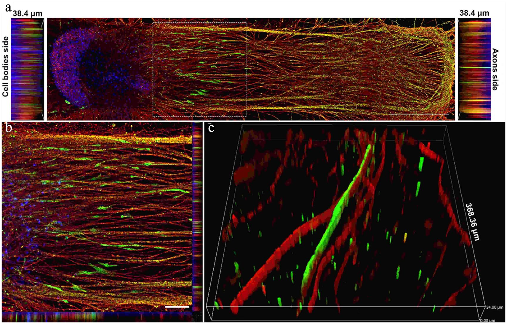 Schwann cells migrated out of the spheroid and elongated along the axons. (a) Image showing how human Schwann cells (hSCs) stained for the hSC marker S100 (green) migrated out of the spheroid along with growing axons stained for βIII-tubulin (red) over a period of 4 weeks. Nuclei were labeled with DAPI (blue). Scale bar: 1000 µm. (b) High-magnification image of inset from image A. Scale bar: 25 µm. (c) 3D image showing close-up of the relationship between hSCs (green) and myelinated axons (red). Slice size was 368.36 × 368.36 × 34.00 µm. Adapted from Sharma et al. 119