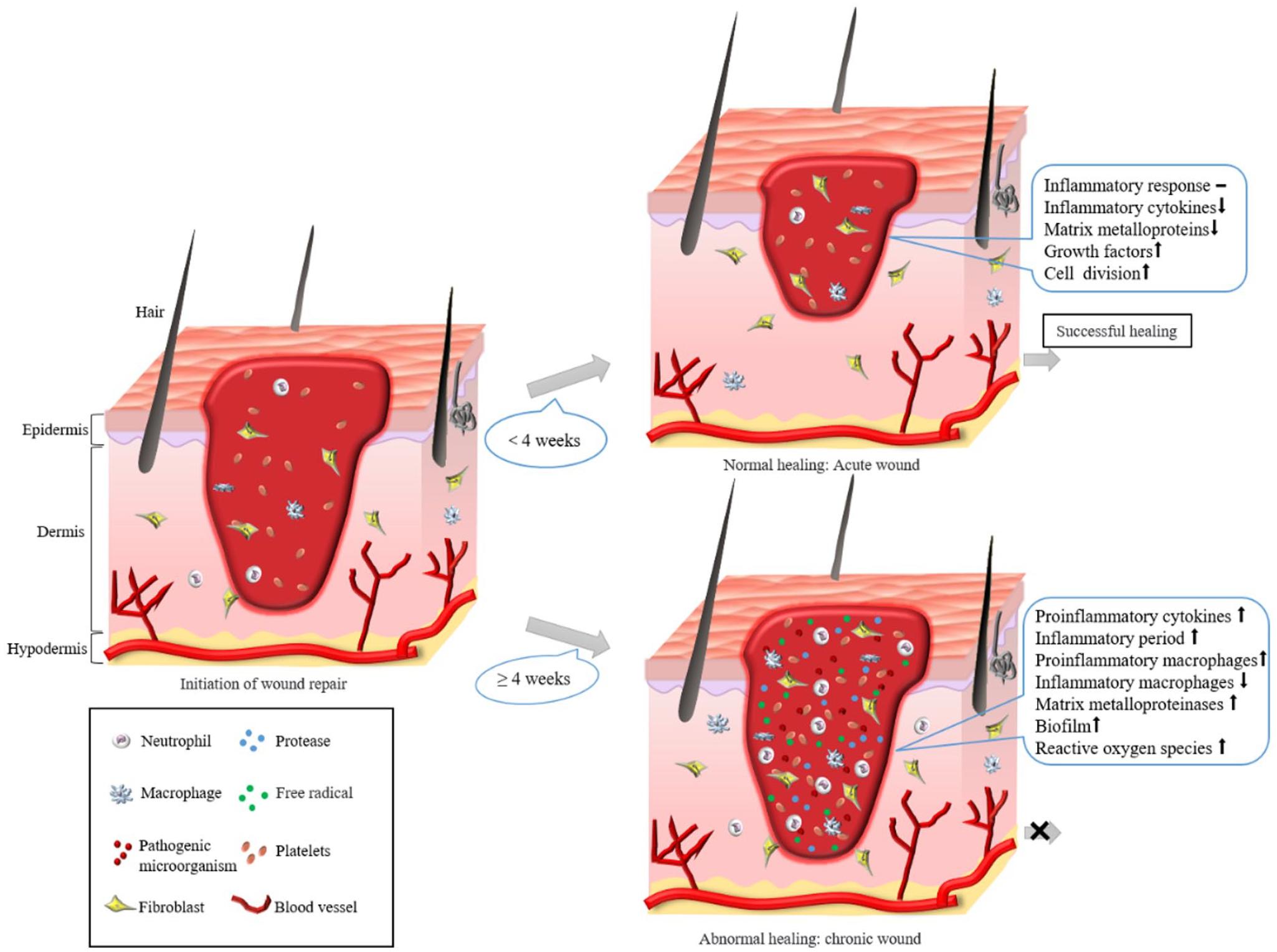 Schematic diagram of acute and chronic wound healing.