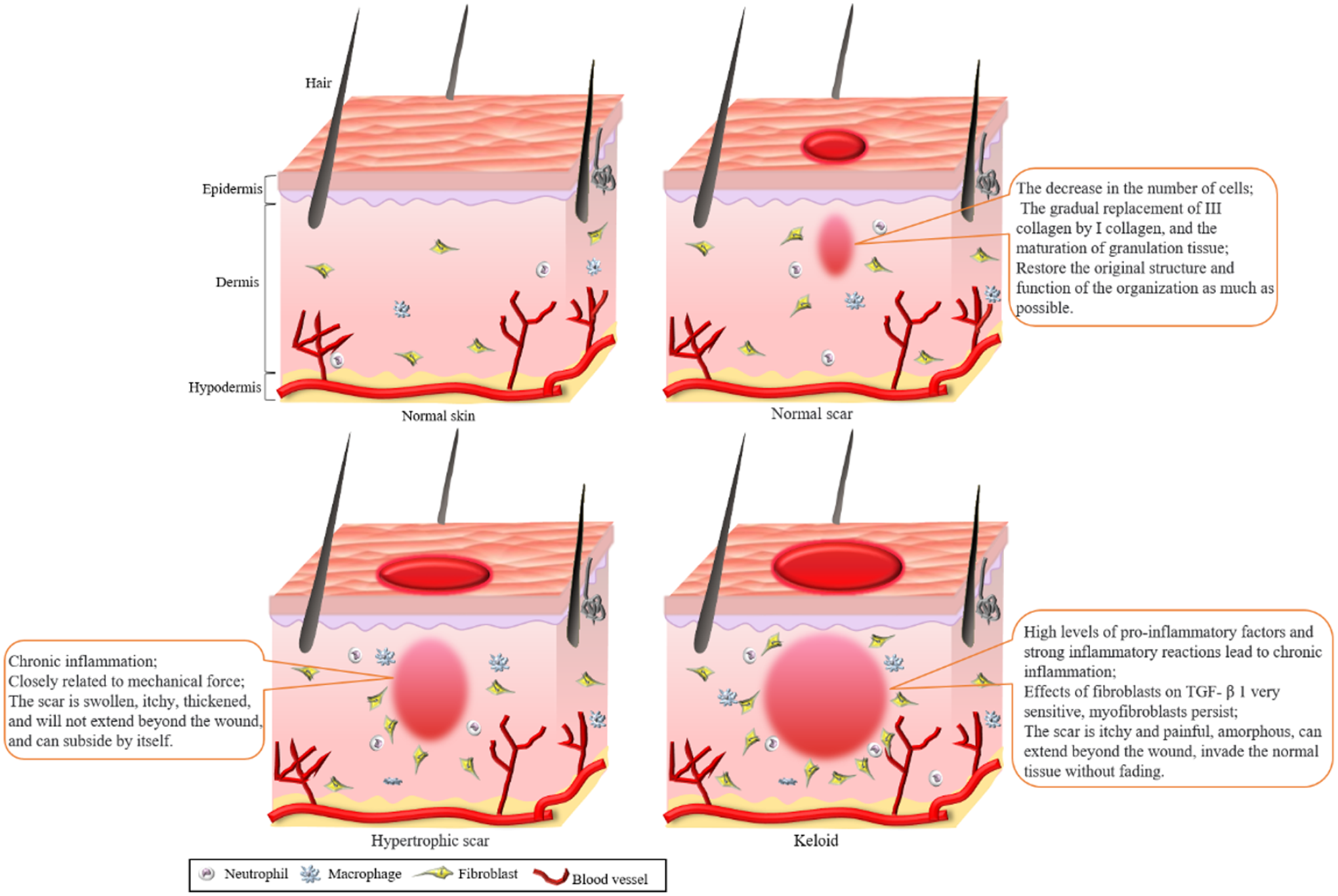The ideal healing of skin wounds is regeneration rather than repair. Skin injury repair refers to the process of blood clotting and recovery immediately after injury. In this process, local cell repositioning and collagen precipitation occur, so as to restore the damaged tissue. However, scar is usually produced instead of re-establishing the normal tissue structure. 35 Skin injury regeneration means that when the tissue is damaged only by the epidermis or superficial dermis, it can produce the same structure as the original tissue, and some epidermal appendages will also form. The new skin will be the same as the original skin, without causing scars. However, if the skin injury is too serious, it will inevitably form a large number of fibrous tissues covering in the process of repair, resulting in the formation of scars, thus causing the skin to lose its integrity and beauty. 36 Wound healing is a dynamic and complex process involving a large number of cells and cytokines, and each cell cooperates and communicates closely with each other to achieve rapid and effective repair of damaged tissue. 37 However, pathological wound healing occurs if the disorder occurs in the wound healing process. 38 The normal formation or overgrowth of scar during wound healing and the possible causes are summarized, as shown in Figure 2.