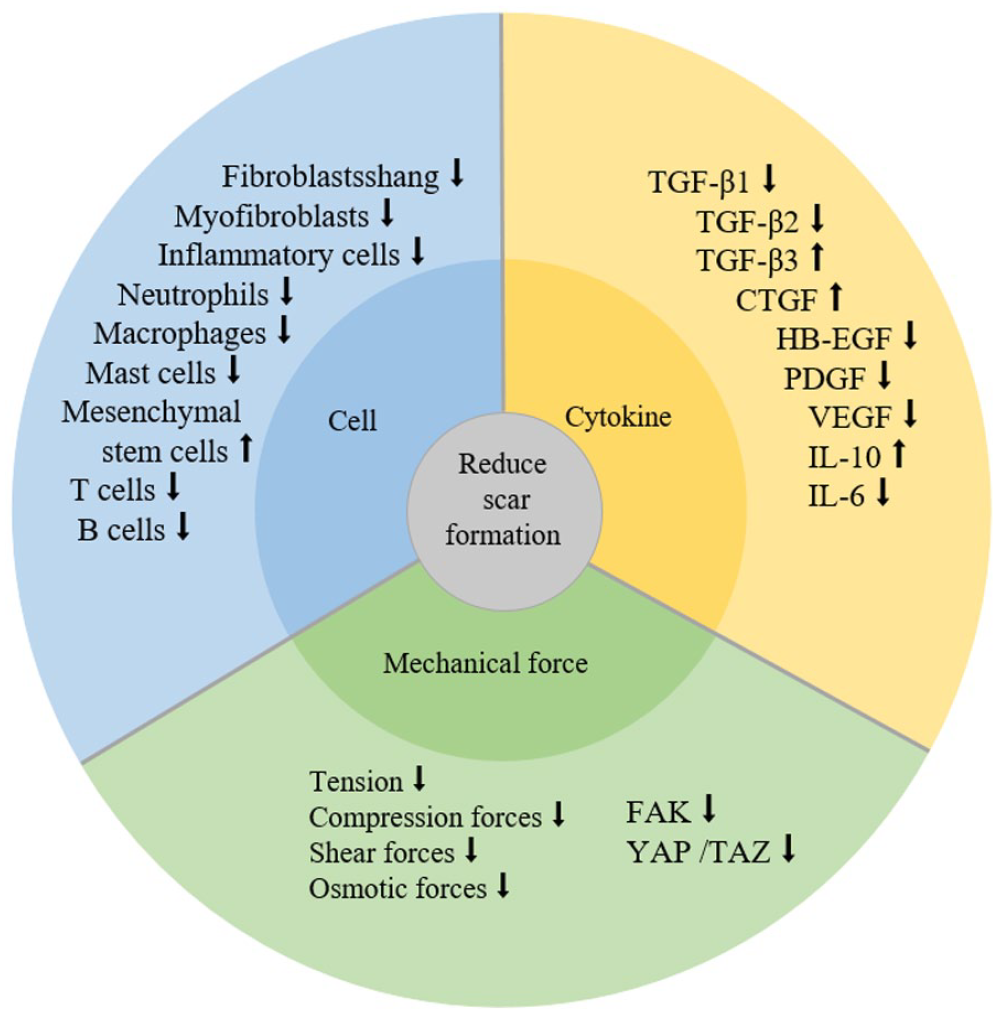With the understanding of mechanisms of scar formation, various technologies for reducing scar or promoting scarless have been developed. The aim of regeneration engineering is to develop a method that can regenerate tissues or organs after injury. 90 A variety of latest techniques and methods to promote scar-free wound healing were introduced.
