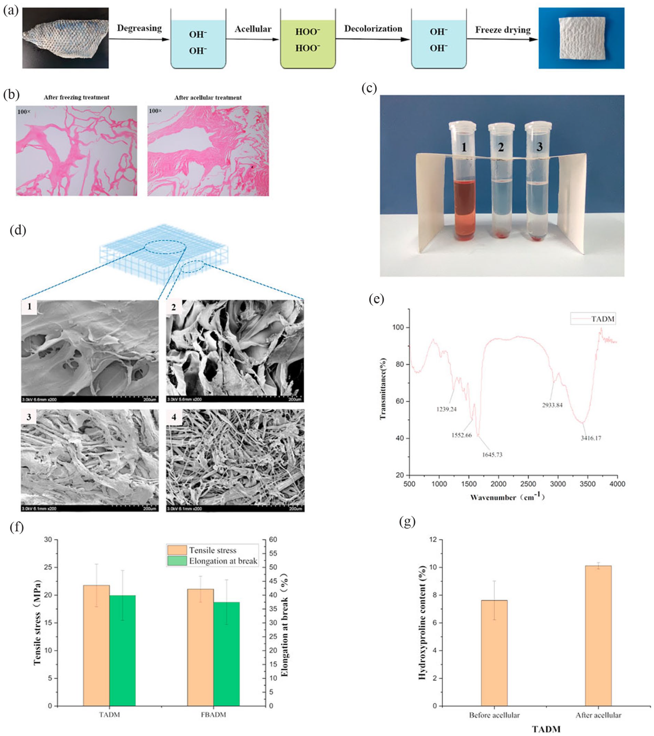 Preparation and characterization of tilapia acellular dermal matrix: (a) is the flow chart of tilapia acellular dermal matrix preparation, (b) is the H&E staining map of tilapia skin before and after acellular treatment, the cells in the frozen fish skin have been broken, there are no obvious cellular characteristics, and there is no cell structure at all after further decellularization, (c) is the result diagram of hemolysis, (d) is the scanning electron microscope, (e) is the Fourier transform infrared spectrum (FTIR), amide A/B/Ⅰ/Ⅱ/Ⅲ and other type I collagen characteristic peaks are obvious, (f) is the comparison of mechanical properties of each sample, and (g) is the comparison of hydroxyproline content of tilapia skin before and after acellular. 106