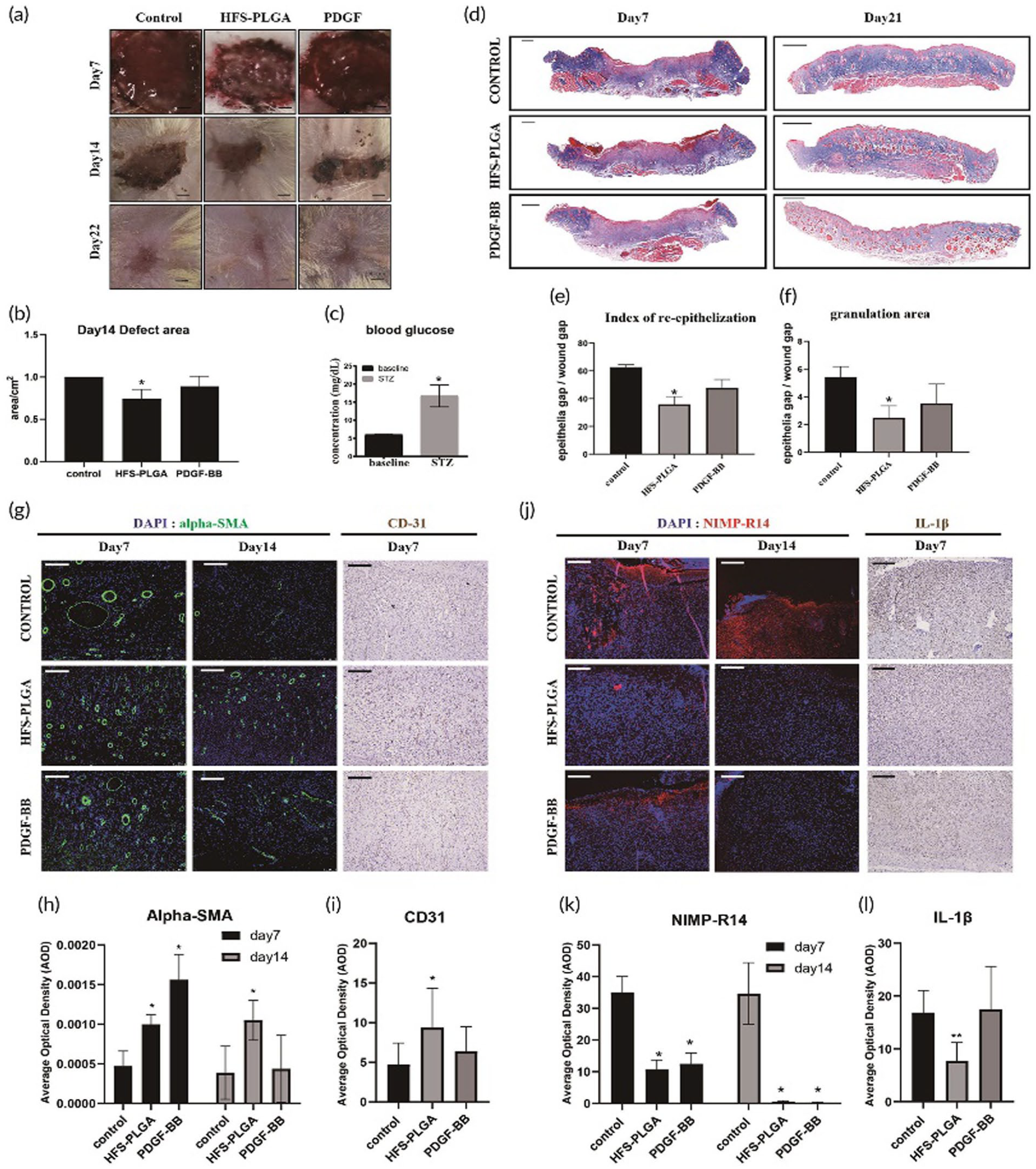 HFS-PLGA promotes rapid healing of streptozotocin (STZ) -induced dermal wound and reduces scar formation in diabetic rats. On day 7, HFS-PLGA promoted the regeneration of wound epithelial cells. Angiogenesis was accelerated on day 7 and 14, and granulation area and scar formation were reduced on day 22: (a) representative picture of dermal injure at 7,14,21 days post-surgery. Scalebar=1.5 mm, (b) semi-quantification result of the wound area. The relative wound area of all groups was measured using image J. ANNOVA test, N=4 *