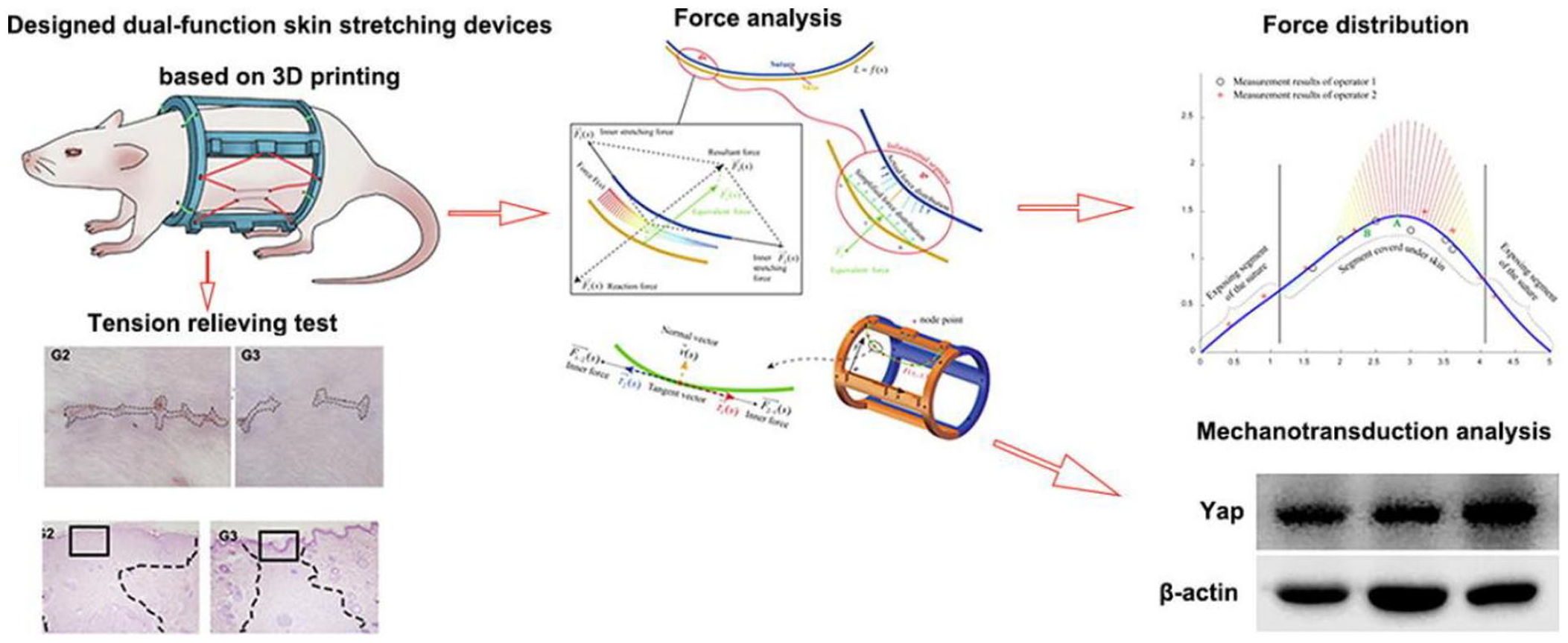 A device attached to the skin of rats to conduct tests on stretching and tension relief. In the skin stretching test, the mechanical load of the skin stretching outward can exert different forces on the skin and cause changes in the tissue characteristics of the skin epithelium. In the tension relief test, the edge of the wound can be pulled in the opposite direction to accelerate the wound closure and reduce the cross-sectional size of the scar. Western blot showed that the mechanical sensitive molecule YAP was related to the mechanical force applied on the skin. 131