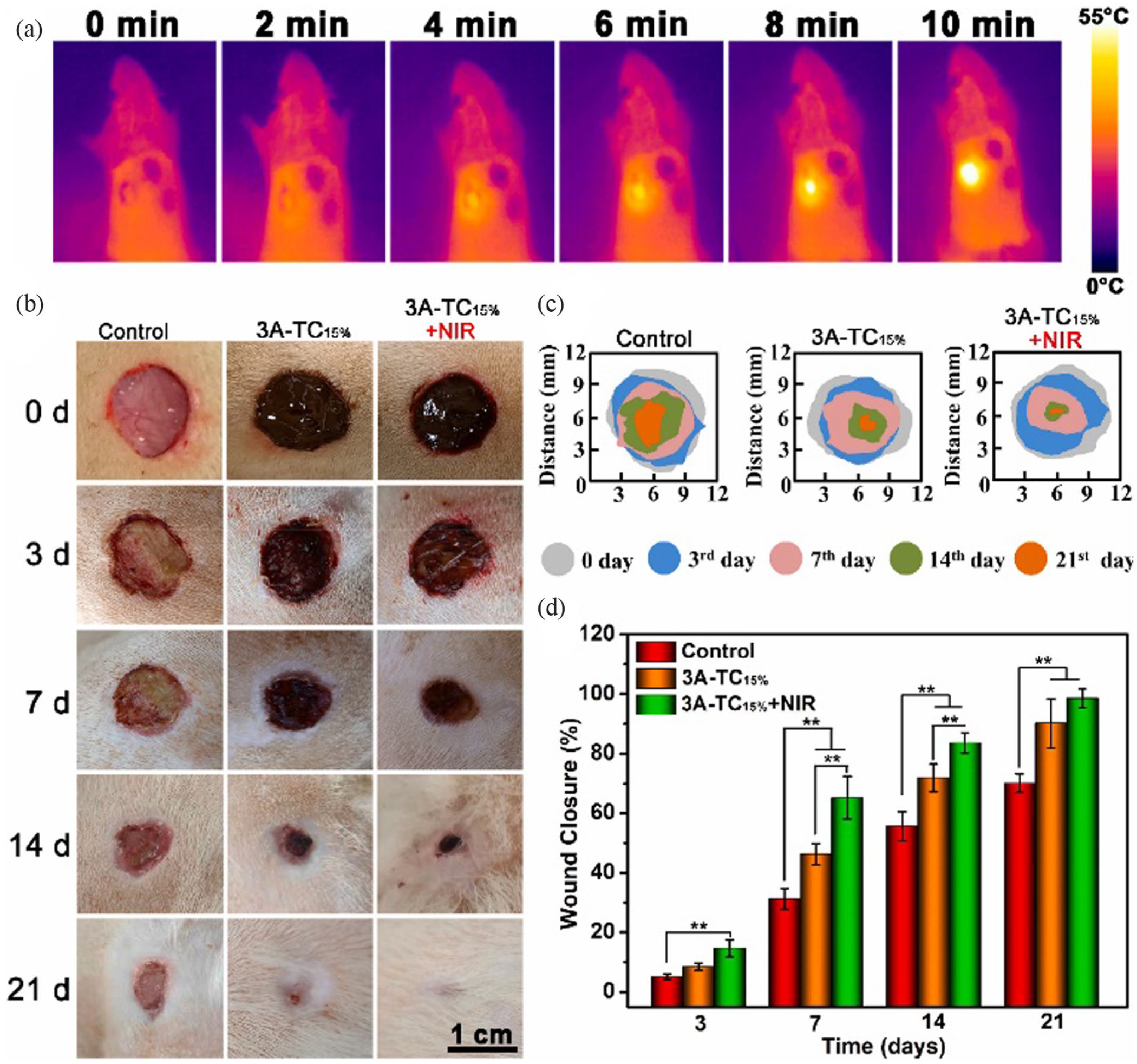 3A-TCMBA +NIR promotes closure of infected wounds and results in scarless healing: (a) photothermal temperature change of SD rats, (b) representative photographs of the wounds treated with samples, (c) schematic diagram of wound closure, and (d) quantitative statistical analysis of wounds closure. 212