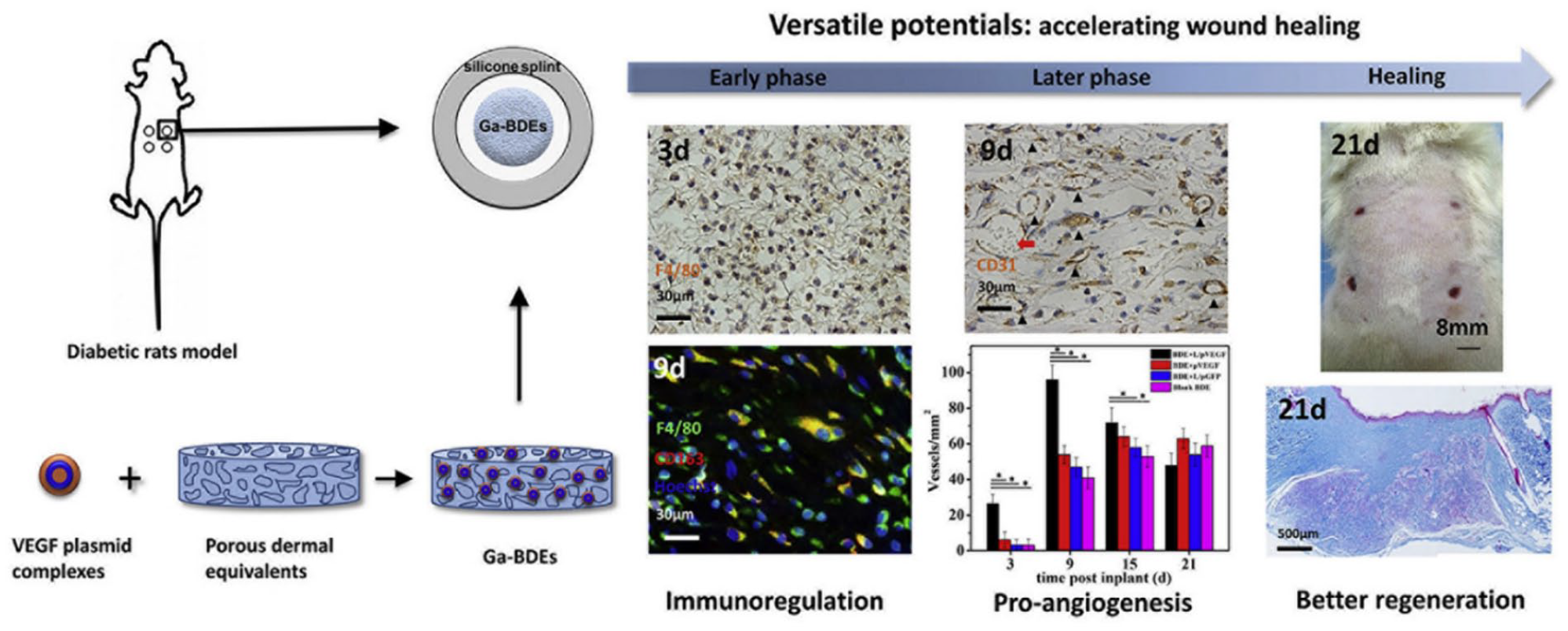 Ga-BDEs were constructed by using VEGF plasmid complex and porous dermal equivalent to treat diabetes wound model in mice. The use of Ga-BDEs can regulate immune response, accelerate the formation of vascular tissue, and promote wound healing and regeneration. 215