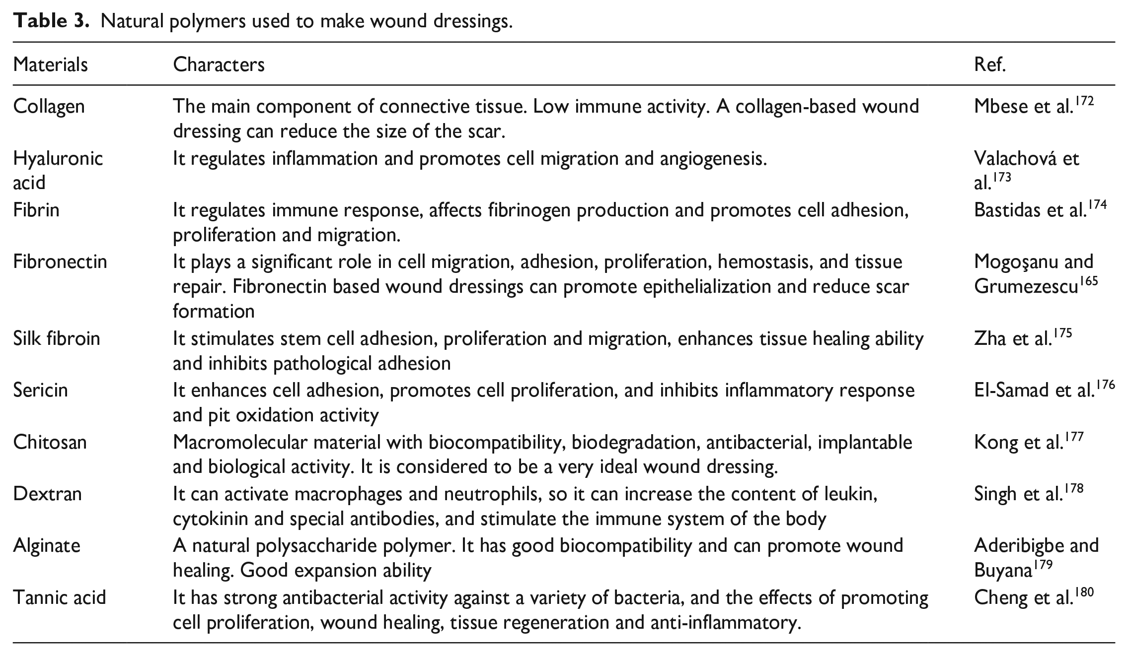 Skin substitutes made by mixing various biological and non-biological materials have made significant achievements in promoting skin wound healing. Various natural and synthetic polymers have been used to make wound dressings, mainly in the form of hydrogels, films, microspheres, scaffolds and sponges. 163 Especially in the past 5 years, great progress has been made in the field of skin tissue engineering substitutes. The wound dressing has good histocompatibility, low toxicity, and low inflammatory response, can keep the wound environment moist and promote cell proliferation and differentiation, and has a certain mechanical strength to prevent wound infection. 164 Meanwhile, wound dressings can also carry some drugs, cytokines, and other biological agents to accelerate healing and inhibit scarring. 163 Therefore, some natural polymers such as polysaccharides, proteoglycan, and proteins have been well developed in skin tissue engineering. Natural polymers for synthetic biomaterials are summarized in Table 3. 165 For instance, collagen is a macromolecular compound, has the highest content, the widest distribution and low immunity in mammals, so it has been widely used for wound healing. 166 Improved collagen hydrolysate powder and collagen glycosaminoglycan sponge can combine keratinocytes and fibroblasts to repair with the wound closed quickly, low inflammatory reaction, and smaller and softer scar.167,168 Some metal ions can be added to modify the material of gelatin substrate. For instance, zinc and curcumin can be added in 3D collagen scaffold for promoting angiogenesis and increase the expression of TGF-β3 to reduce scarring. Because zinc can promote keratinocyte migration, re-epithelialization, and act as a cofactor for MMPs, while curcumin can regulate inflammatory factors and inhibit the inflammatory response.169,170 The addition of AgNP and graphene oxide can give the gelatin scaffold antibacterial properties and the properties of destroying the bacterial film, preventing external infection events that occur after implantation. 171