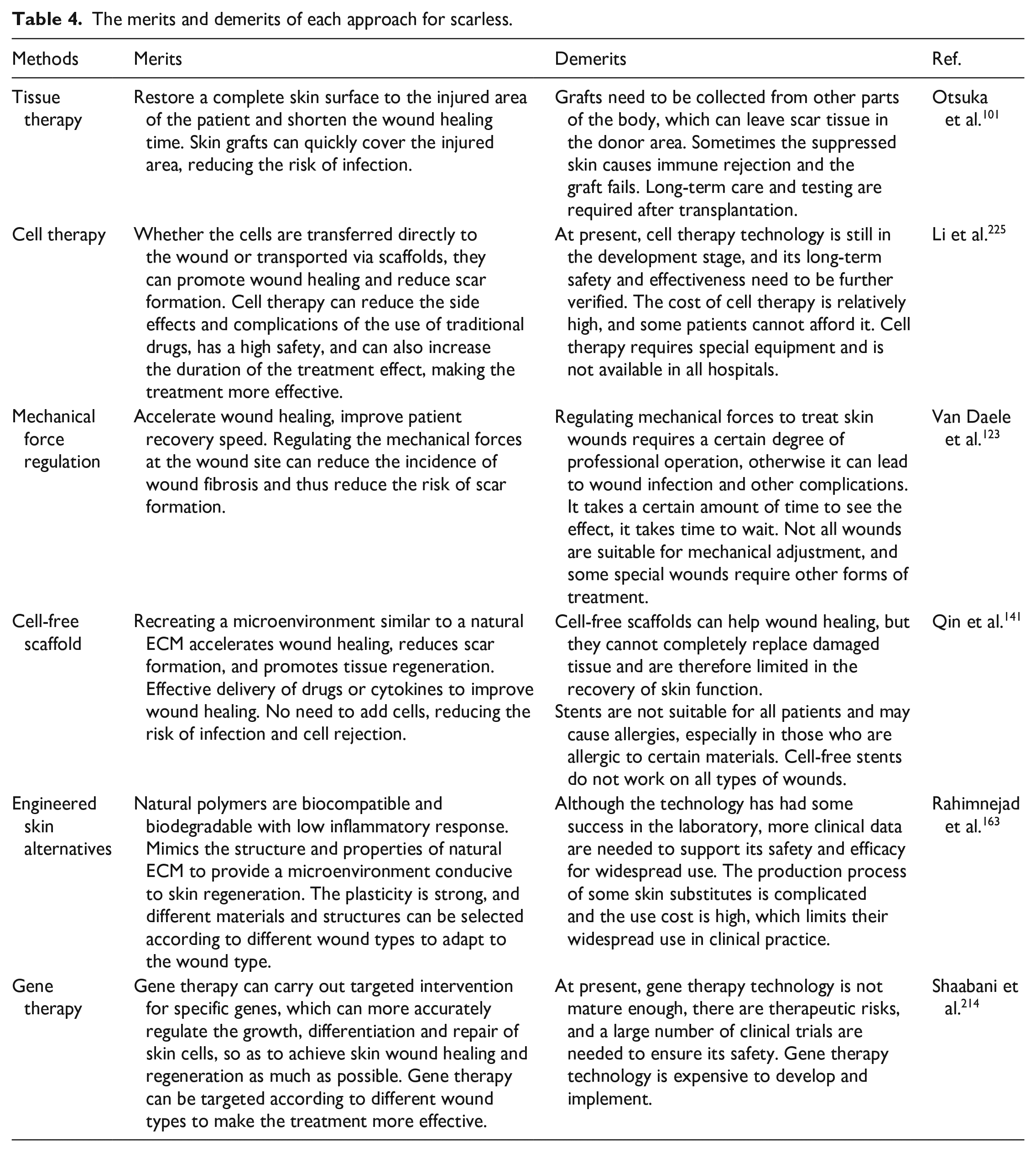 In conclusion, although these technologies reduce or prevent scar formation to some extent, they are not the most ideal methods. Thereby the merits and demerits of each approach are summarized in Table 4.