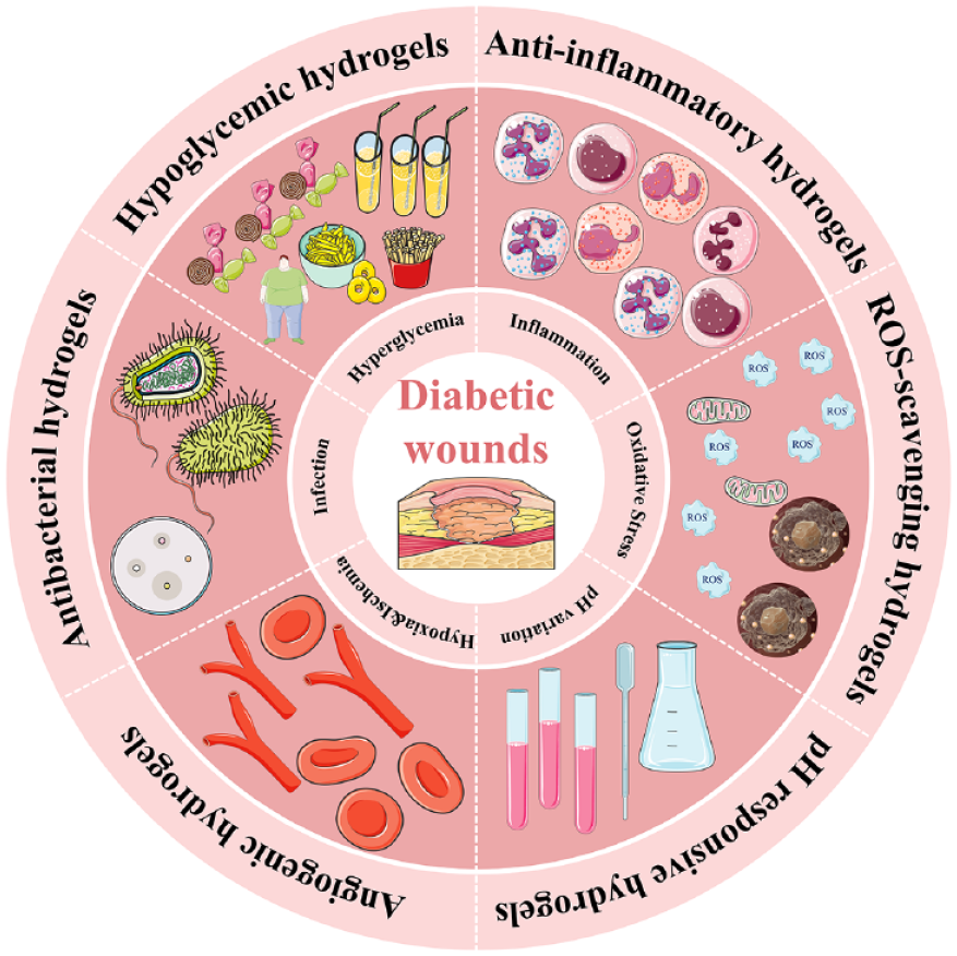 The prevalence of diabetic wounds presents a critical clinical challenge due to its impact on patients’ quality of life, causing discomfort, odor, and potential disability. Prolonged wounds can undermine patient confidence in treatments, fuel resistance to medical interventions, and worsen disease progression, imposing significant healthcare burdens and economic strain on society. This situation necessitates effective solutions to manage chronic wounds, especially those related to diabetes. The development of hydrogels tailored to the diabetic wound microenvironment offers promising prospects for addressing various healing stages. Through ongoing research advancements, hydrogels stand as potential solutions for the clinical treatment of chronic wounds.