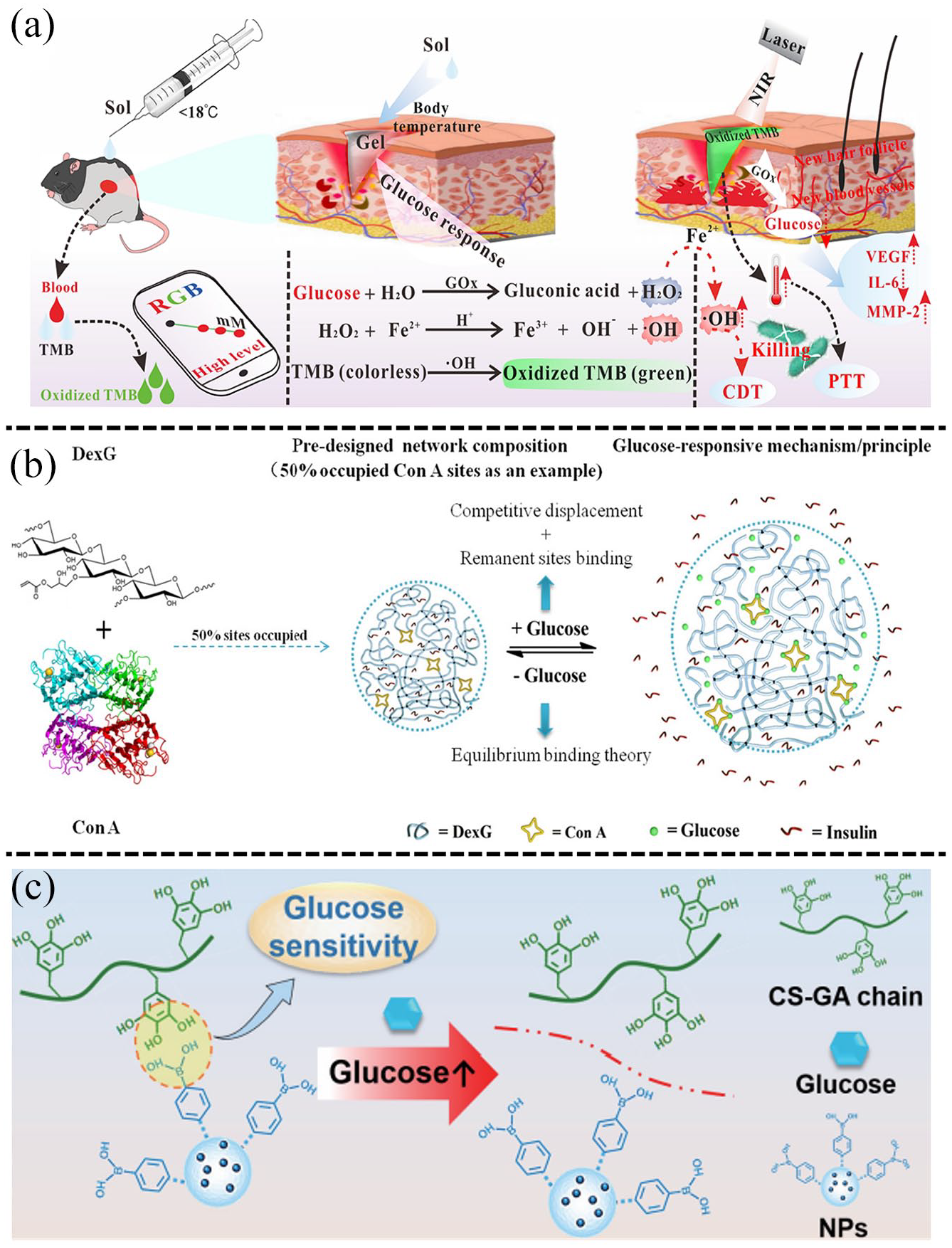 The glucose-responsive hypoglycemic hydrogels: (a) the glucose-responsive TMB/Fe2+/PF127 hydrogel based on GOx and its application in promoting diabetic wound healing. Reproduced with permission. 83 Copyright 2023, American Chemical Society, (b) con A-DexG based system and its glucose-responsive and hypoglycemic effect mechanism in vitro. Reproduced with permission. 84 Copyright 2018, Elsevier B.V, and (c) the glucose-responsive ODEX-DA/HTCC hydrogels based on PBA for releasing insulin NPs to exert hypoglycemic effect. Reproduced with permission. 88 Copyright 2023, Springer Nature.