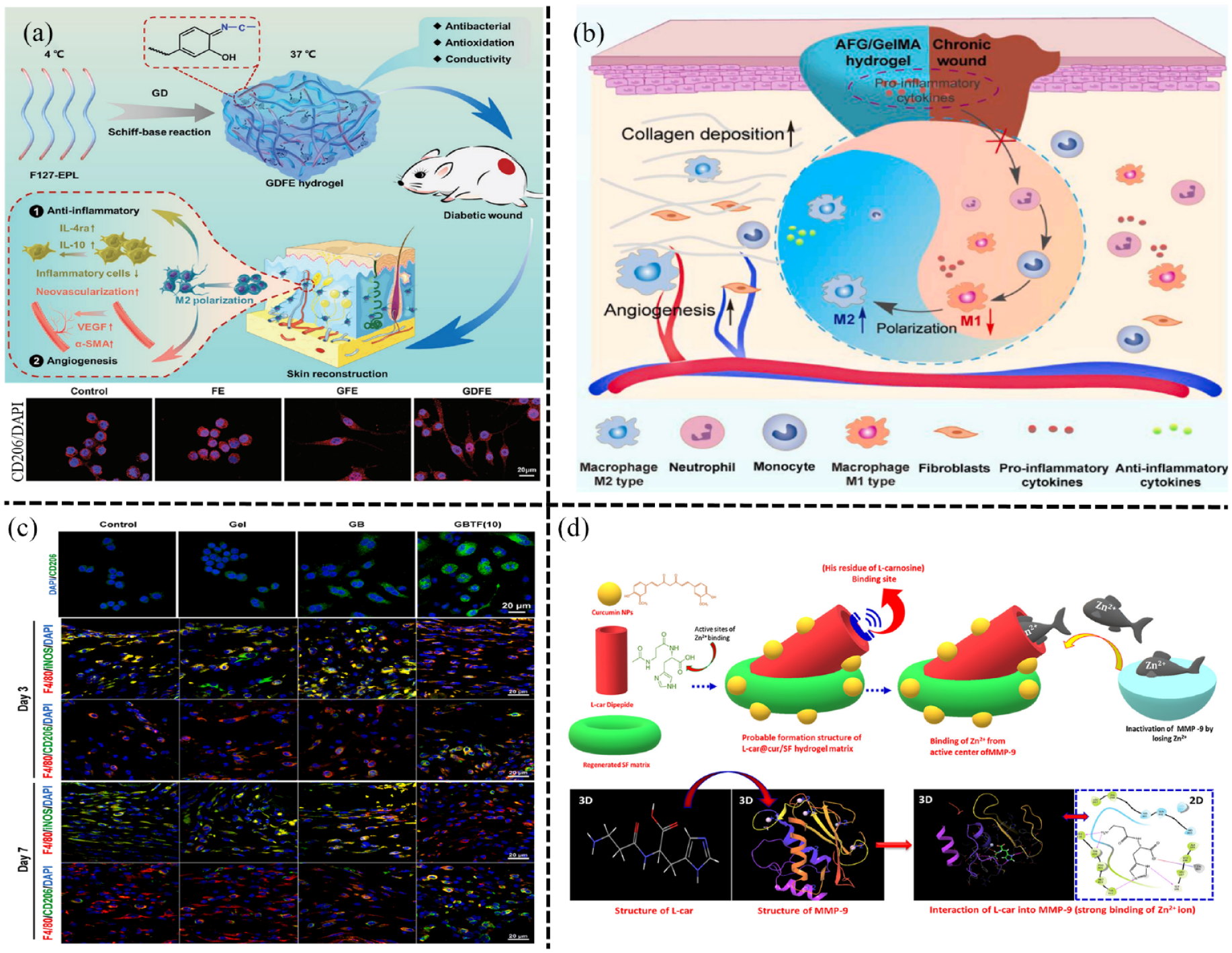 The anti-inflammatory hydrogels based on modulation of macrophage polarization and decreasing the expression of MMP-9 in diabetic wound: (a) the GDFE hydrogel could effectively activate macrophages polarization to M2 phenotype, and remarkably accelerated wound healing. Reproduced with permission.