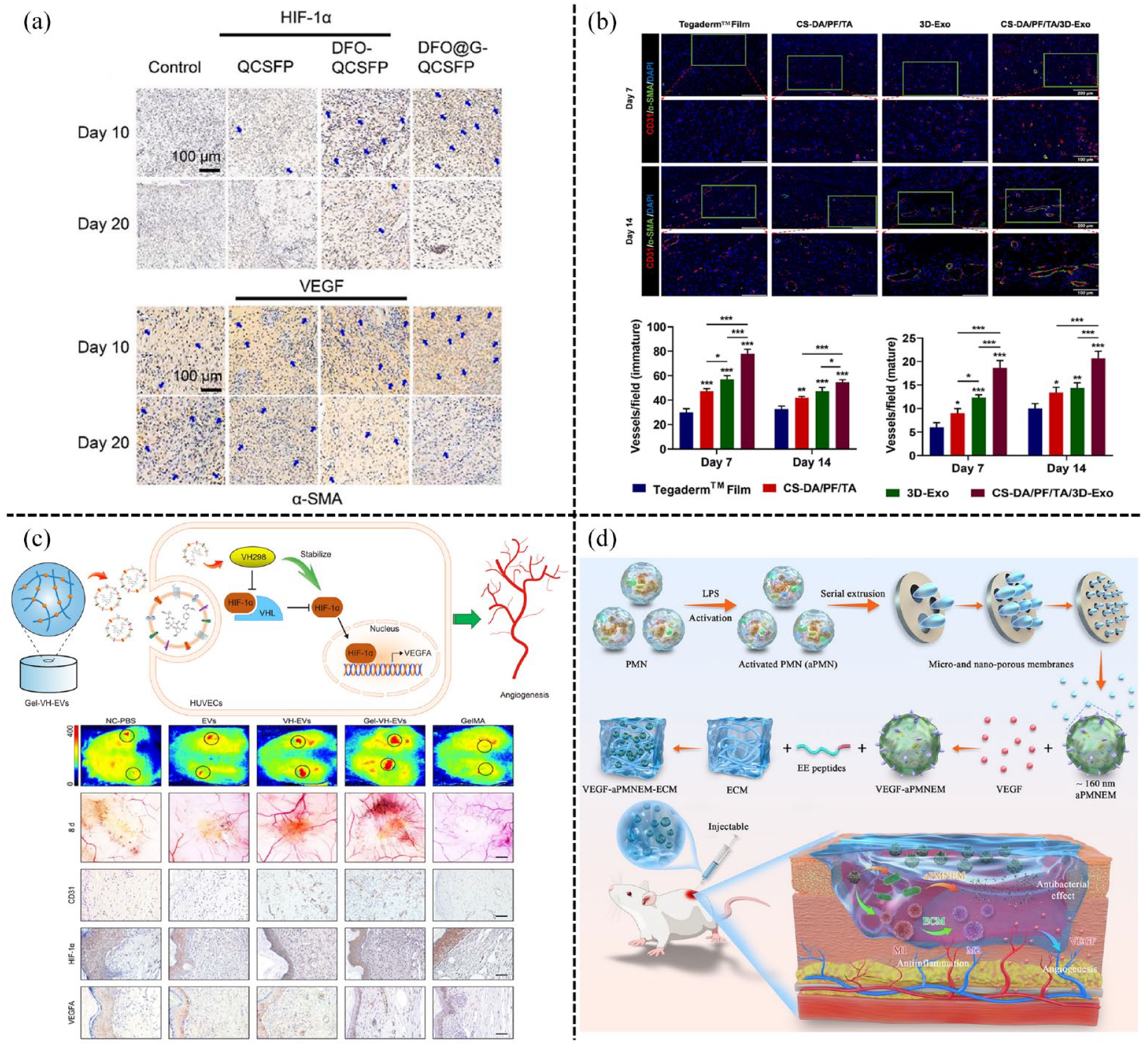 The angiogenic hydrogels in diabetic wounds: (a)the self-adaptive DFO@G-QCSFP hydrogel released DFO@G on demand to promote angiogenesis and accelerated the wound healing of diabetic rats. Reproduced with permission. 144 Copyright 2022, Elsevier B.V, (b) the CS-DA/PF/TA/3D-Exo hydrogel exhibited stronger vascular promoting ability. Reproduced with permission. 132 Copyright 2023, Elsevier B.V, (c) the Gel-VH-EVs released the VH-EVs to enhance angiogenesis in diabetic wound via HIF-1α mediated pathway. Reproduced with permission. 61 Copyright 2022, Elsevier Ltd, and (d) VEGF–aPMNEM–ECM hybrid hydrogel promoted diabetic wound repair through enhancing the long-distance reproduction of VEGF. Reproduced with permission. 63 Copyright 2023, Springer Nature.
