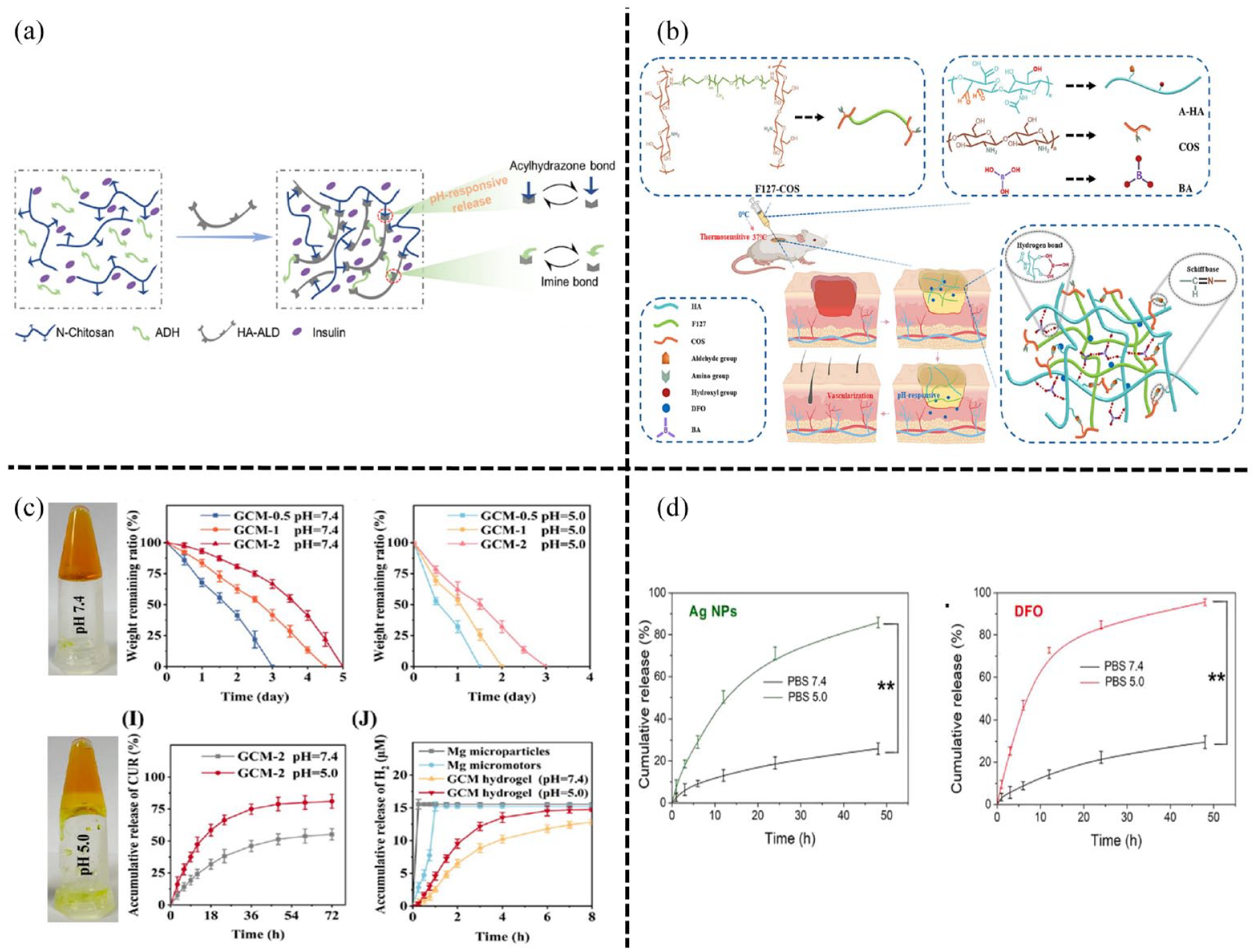 devised a self-healing and injectable hydrogel using polysaccharide components coupled with insulin glargine, created by integrating N-carboxyethyl chitosan (N-CS), HA-aldehyde (HA-ALD), and adipic acid dihydrazide (ADH) through reversible dynamic bonds like acylhydrazone and imine bonds (Figure 7(a)). This hydrogel exhibited pH-responsive characteristics owing to the inherent instability of the hydrazone bond in acidic conditions. The research findings highlighted that when the pH decreased from 7.4 to 6.5, the hydrogel degraded faster, resulting in the sustained release of insulin glargine over a 14-day period. Consequently, this property aided in diabetic wound healing by lowering glucose levels, promoting granulation tissue formation, enhancing collagen deposition, expediting re-epithelialization, and fostering neovascularization. Tang et al. developed a pH-responsive and thermosensitive injectable self-healing hydrogel by combining chitosan oligosaccharide (COS) with Pluronic F127 (F127-COS), hyaluronic acid treated with sodium periodate (NaIO4), COS, and boric acid (BA; Figure 7(b)). This formulation, termed FCAB hydrogel, was loaded with DFO to aid in diabetic wound healing and tissue regeneration. This enhanced and precise delivery of DFO under specific pH conditions showcased potential for promoting vascularization and aiding in wound healing.