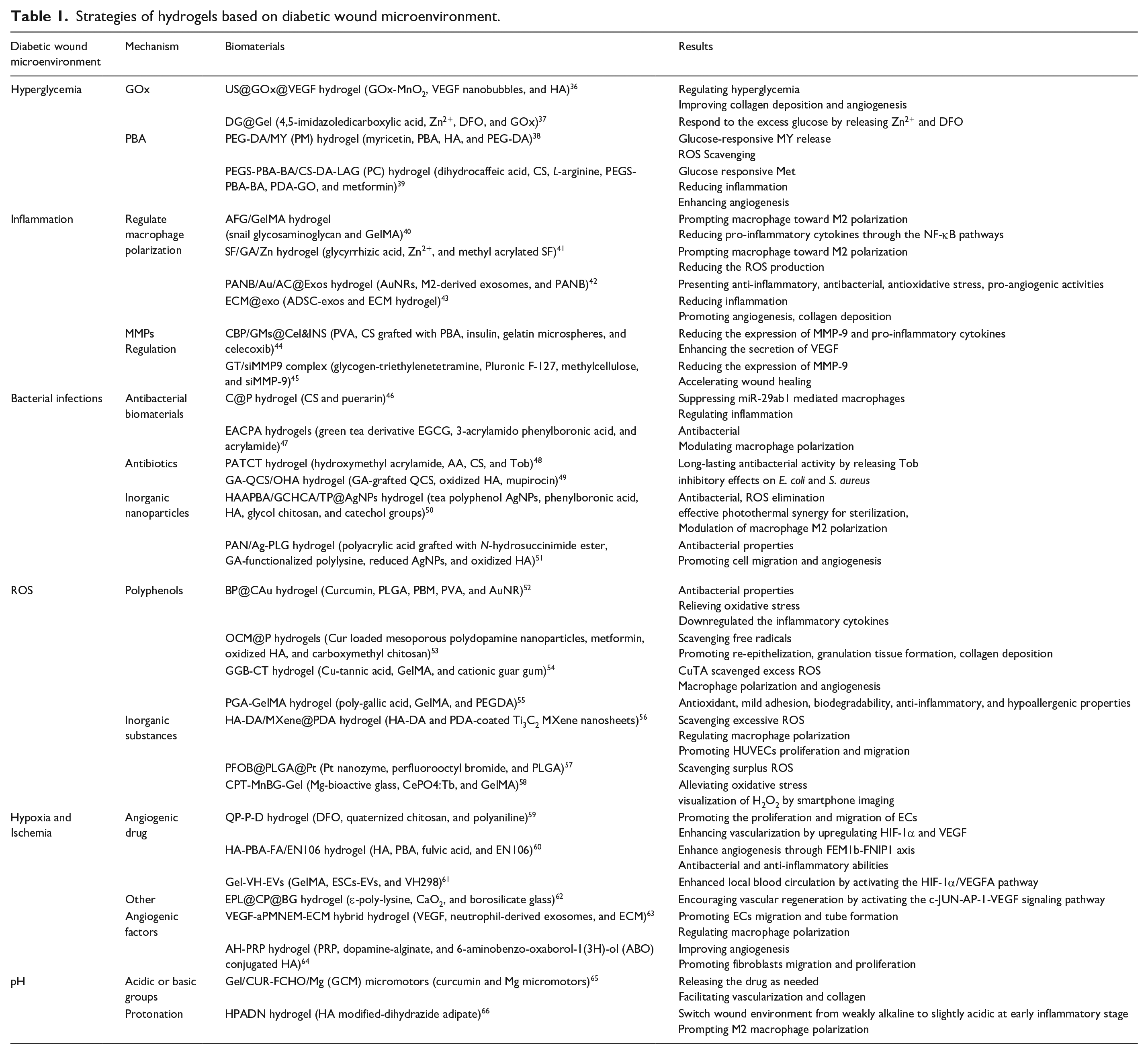 The concept of the wound microenvironment was first introduced by Carla R. Kruse and colleagues in 2015. This theory encompasses both the external and internal components of the wound microenvironment, providing a comprehensive understanding of the factors influencing the healing process. 35 The wound healing process in diabetic wound deviates from the conventional steps and fails to generate the appropriate anatomical structure or restore physiological function due to their intricate microenvironment which remains in persistent chronic inflammation, recurrent infections, and vascular impairment associated with hyperglycemia, thus the healing period generally sustain more than a month clinically. Nowadays, hydrogels have demonstrated significant potential in the field of wound healing, especially in the context of diabetic wounds. Their porous structure, high water absorption, and biocompatibility make them excellent candidates for wound dressings. By being classified into natural and synthetic categories, hydrogels offer diverse options for biomedical applications. In the case of diabetic wounds, where the microenvironment poses unique challenges, hydrogels present an array of properties that can be customized to address these specific concerns. The ability to regulate hyperglycemia, monitor wound status, respond to pH changes, combat bacteria, reduce ROS levels, and promote angiogenesis can significantly contribute to improving the healing process in diabetic wounds. Herein, we are committed to meticulously classify and succinctly summarize the alterations occurring in the microenvironment of diabetic wounds, as well as recent advancements in hydrogel-based wound dressings, aiming to provide a comprehensive understanding of diabetic wounds’ pathogenesis, with a specific focus on the application and customization of hydrogels to better suit their complex microenvironment (detailed in Table 1). It will also cover the modification techniques, incorporation of bioactive agents, and innovative strategies implemented in hydrogel formulations to cater to the specific needs of diabetic wound healing.
