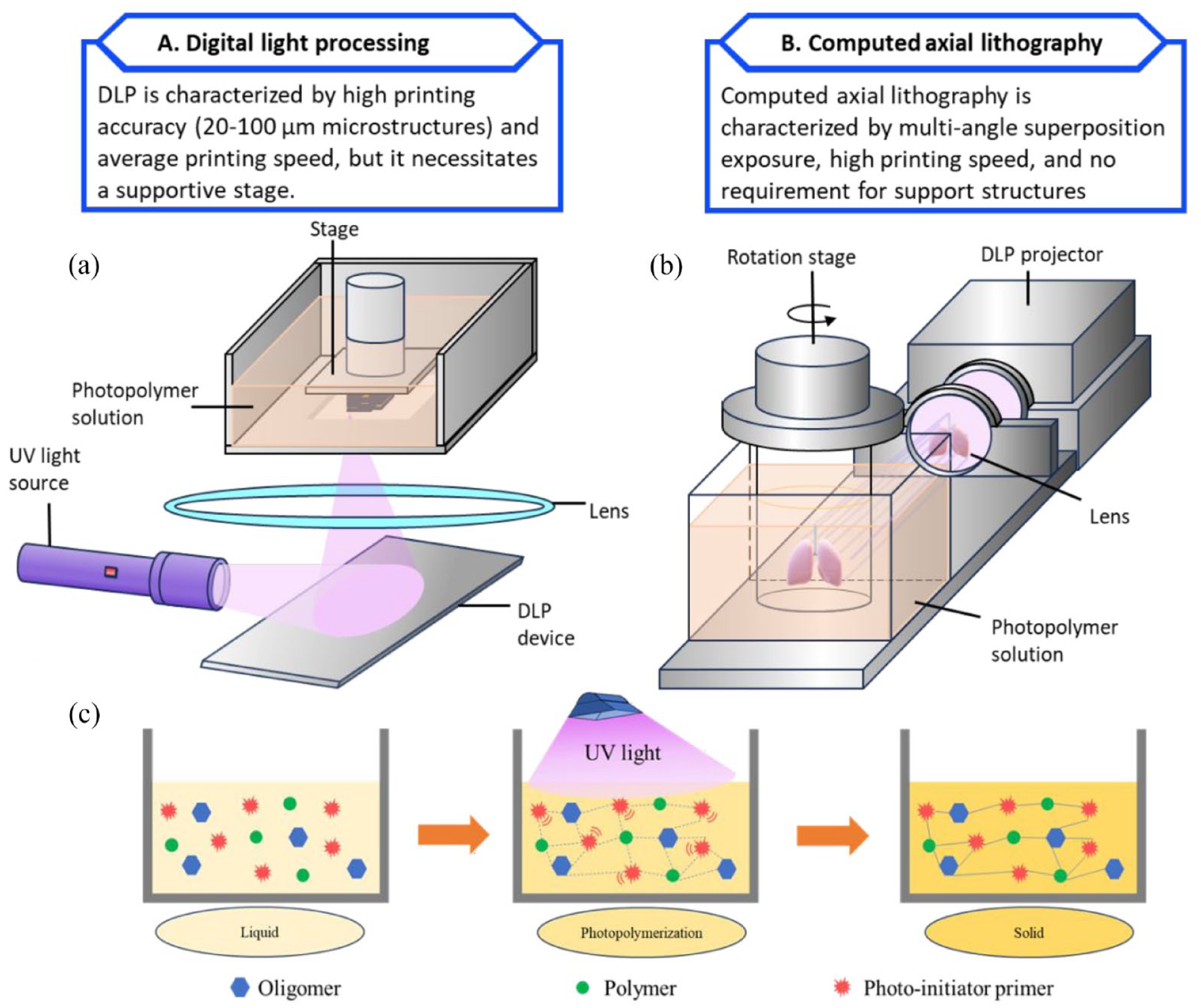 DLP bioprinting is favored for microtissue applications due to its high fabrication speed (100–1000 cubic millimeters per second) surpassing conventional methods, as well as its efficient photopolymerization process at various wavelengths, enabling the creation of complex structures with micrometer-sized resolutions for microvascularized tissue models. 31 Figure 1 presents the schematic demonstration of the general working process of the latest UV-based 3D printing method.