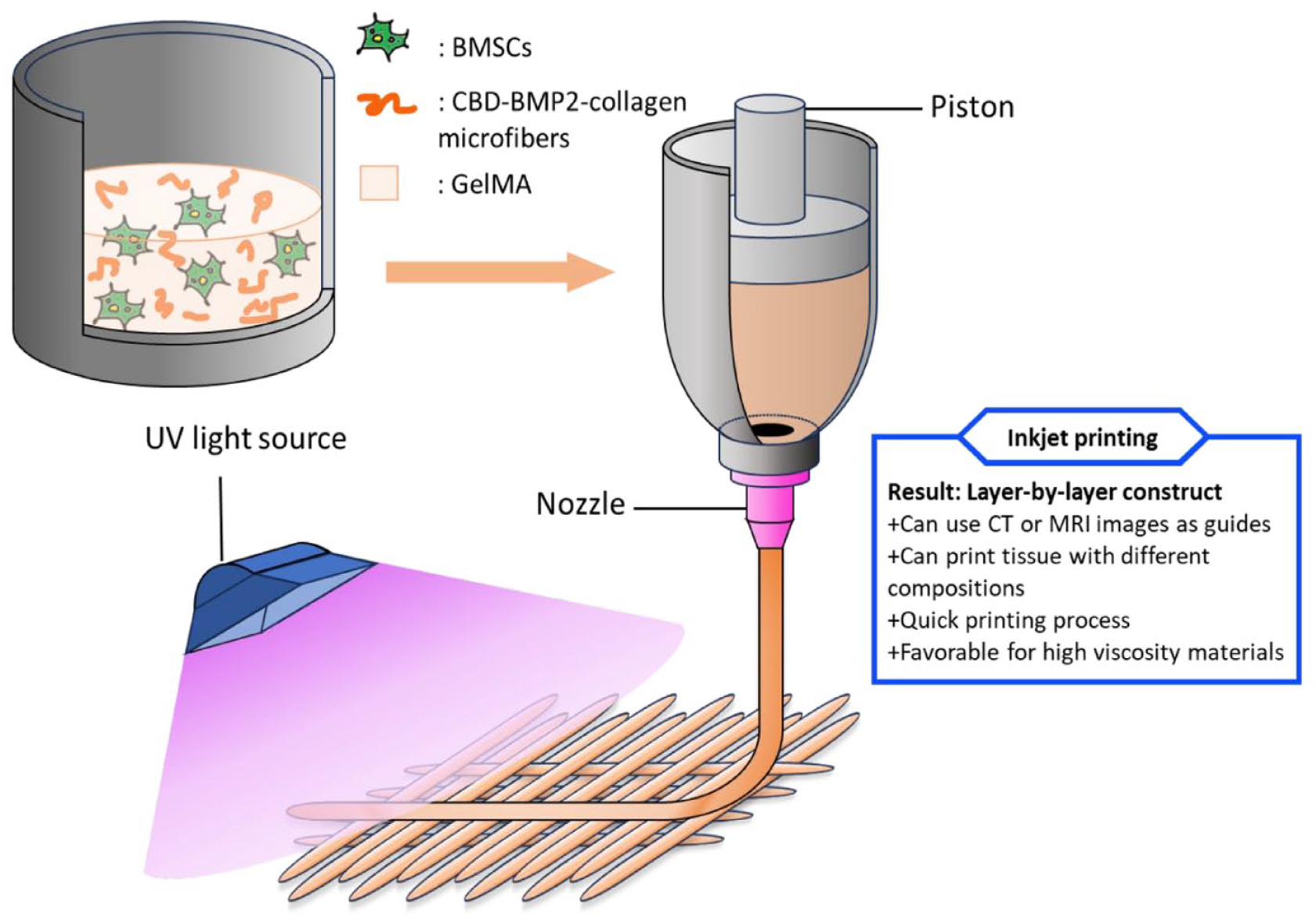 Integration of collagen-binding domain-bone morphogenetic protein 2 (CBD-BMP2) -collagen microfibers into BMSC-laden GelMA scaffolds via a customized 3D printer can be served as a differentiation-control module. 55 The authors used growth factor and protein to induce progenitor cells differentiated into osteocyte differentiation of progenitor cells. Despite of using UV light to induce photopolymerization, the procedure used in the study was not DLP, but inkjet printing (as shown in Figure 3). The results indicated that BMSCs showed high cell viability (>90%) during printing. The differentiation into osteocytes in the printed scaffolds was confirmed by RT-PCR method after seeding BMSC on the hydrogel for 14 days. RT-PCR results revealed a higher expression of osteogenic markers, including alkaline phosphatase (ALP), bone sialoprotein, osteocalcin, and collagen type I, in the protein-enhanced samples compared to the samples without CBD-BMP2-collagen microfibers in the growth medium. The elevated gene expression demonstrated the successful osteogenic differentiation of BMSCs in the 3D printed GelMA scaffolds with CBD-BMP2-collagen microfibers, resulting in a mature osteoblast phenotype more efficiently than the osteogenic medium.