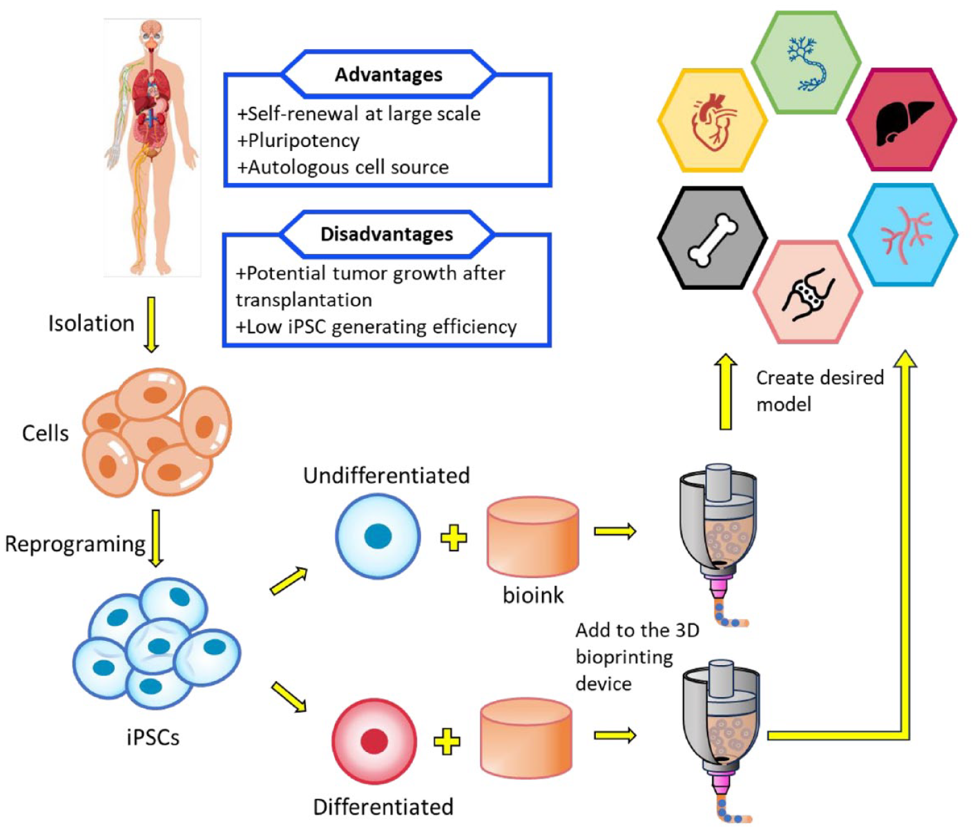 General process of employing iPSCs in 3D bioprinting. First, embryonic cells are isolated from the human body and reprogramed into iPSCs. These iPSCs can then be directly incorporated into the bioink or differentiated into fully matured cells for specific applications before being incorporated into the bioink. Finally, the bioink-cell mixture is loaded into 3D bioprinting devices to fabricate the desired models.