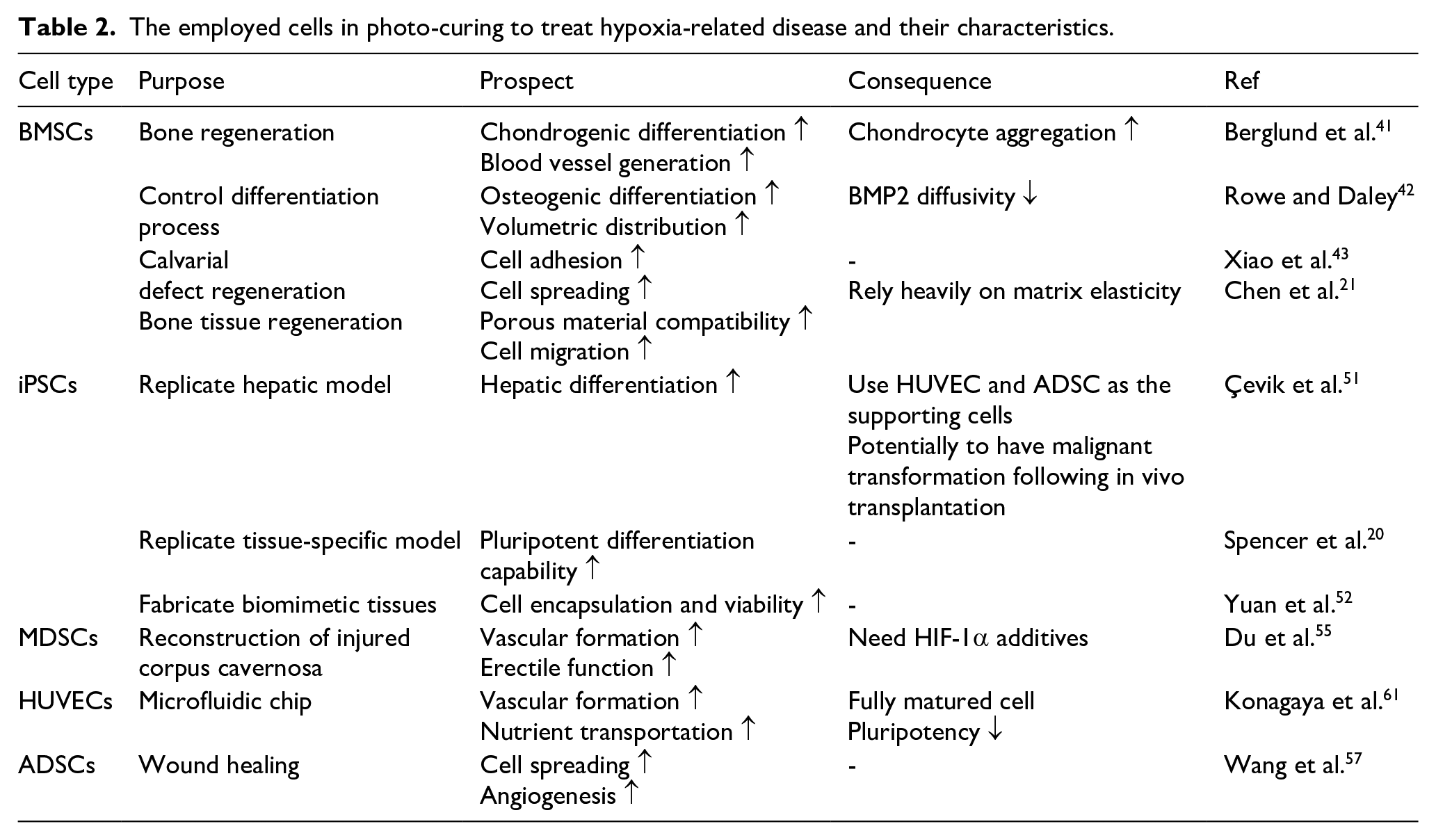 The employed cells in photo-curing to treat hypoxia-related disease and their characteristics.