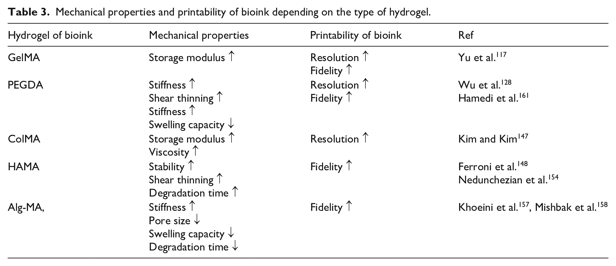 Alginate is a natural bipolymer extracted from brown seaweed, widely utilized in bioink formulations for 3D bioprinting due to its biocompatibility, non-toxicity, and gelation properties. Alginate undergoes ionic crosslinking in the presence of divalent cations (e.g. Ca2+, Sr2+), forming hydrogels that provide a supportive environment for encapsulated cells and tissue regeneration.97,155 However, alginate has limitations in mechanical strength and cell adhesion, requiring modifications to enhance its functionality. 156 Alg-MA is a chemically modified form of alginate, and methacrylate groups are introduced to enable UV photopolymerization. This modification enhances the mechanical properties and printability of alginate-based bioinks by forming stable, crosslinked networks when exposed to UV light in the presence of photoinitiators such as LAP or Irgacure 2959. The degree of crosslinking in Alg-MA can be finely tuned by adjusting the concentration of photoinitiator, and the parameters of UV exposure, such as intensity and UV exposure time.157,158 Also, reaction time to make Alg-MA can affect the mechanical properties of printed structures. High functionalized Alg-MA bioink printed structures showed smaller pores, lower swelling capacity, and faster degradation time. 158 The photopolymerized Alg-MA bioinks retain the biocompatible and non-toxic characteristics of native alginate while providing improved mechanical stability. These properties make Alg-MA based bioinks more suitable for creating 3D structures that support cell encapsulation. 159 Moreover, Alg-MA can be blended with other biomaterials or functionalized with bioactive molecules to further enhance the loaded cell functions and tissue regeneration capabilities.159,160 The photo-curing bio-inks and their associated characteristics are comprehensively summarized in Table 3. In summary, the combination of alginate’s natural biocompatibility with the enhanced mechanical properties provided by methacrylation and UV photopolymerization makes Alg-MA a promising material for advanced applications in tissue engineering and regenerative medicine.