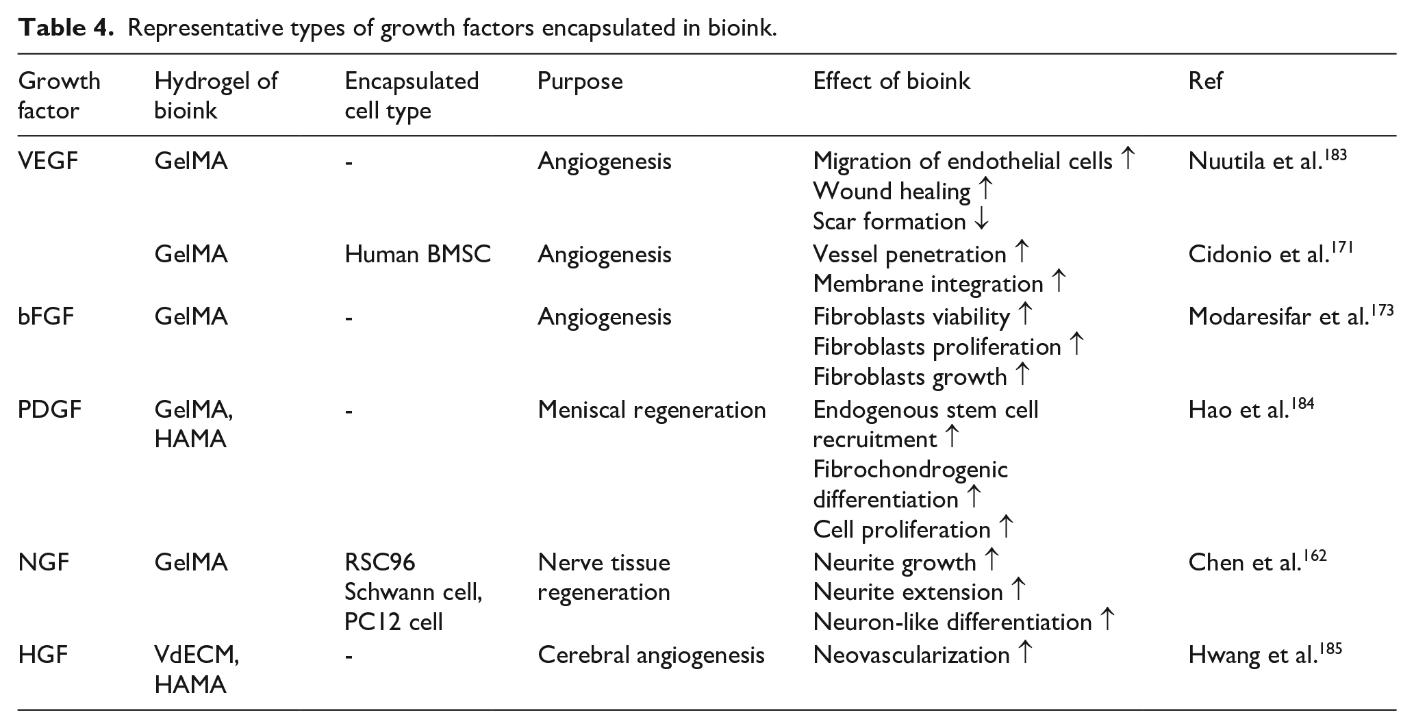 The cell-responsive materials such as peptides and growth factors interact with cells and influence cellular behaviors within printed structures. The inclusion of cell-responsive materials in bioink facilitates improved cell signaling and interaction, contributing to enhanced tissue formation and regeneration.109,171,181,182 Moreover, growth factors can be encapsulated in nanoparticles to regulate release and increase retention capacity. 171 Encapsulated growth factors within nanoparticles in bioink is possible to preserve growth factors from the mechanical stress during the 3D printing process. Also, growth factors loaded nanoparticles can provide precise placement of nanoparticles and growth factors result in enhanced cell proliferation and differentiation. 174 Table 4 encapsulates the growth factors and their effectiveness when incorporated into the bioink.