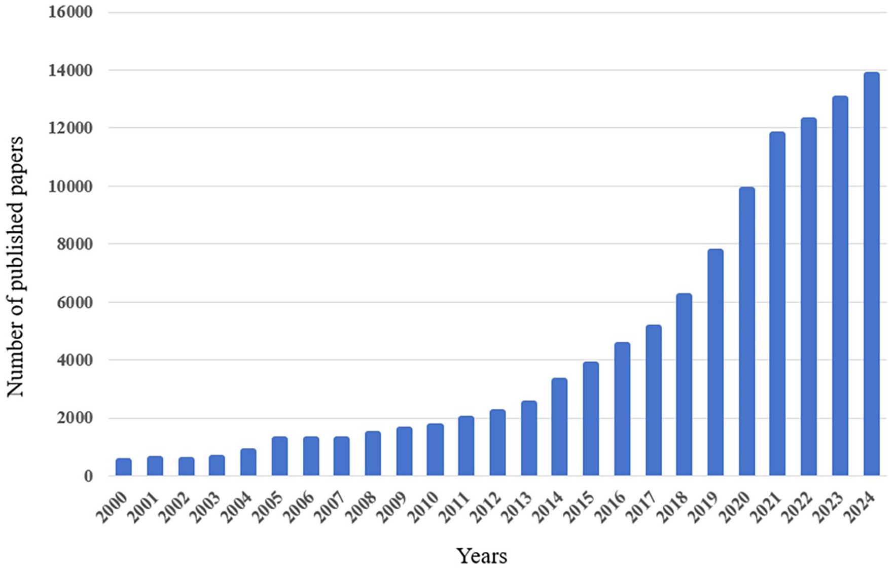 Advances in nanotechnology have significantly impacted the biomedical field. 1 Over the past four decades, various nanomaterial-based drug delivery systems have been developed. 2 Traditional nanoparticles, such as carbon nanotubes, graphene oxide (GO), noble metal nanoparticles (NMNPs), and mesoporous silicon nanoparticles (MSNs), are characterized by controllable particle size, diverse morphologies, and ease of large-scale production. However, these traditional nanoparticles suffer from poor biocompatibility and high immunogenicity. 1 Extracellular vesicles (EVs) have emerged as a promising focus in nanotherapy, potentially addressing the limitations of traditional nanotechnology. EVs are nanoscale lipid bilayer membrane capsules secreted by cells, which can be taken up by recipient cells. 3 They play critical roles in cell communication, including signaling and the delivery of biological cargos. 4 EVs also exhibit immune tolerance, circulatory system stability, and the ability to traverse biological barriers, such as the blood-brain barrier, blood-CSF barrier, and blood-tumor barriers.5 –10 Furthermore, EVs derived from different donor cells inherit unique characteristics and functions from their source cells, making them ideal vectors for diagnosing and treating various diseases.11 –13 Consequently, interest in EVs has grown rapidly, as evidenced by the exponential increase in PubMed publications on EVs every year (Figure 1).