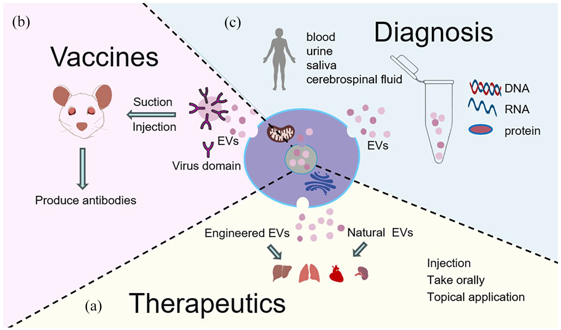 Application of EVs in disease diagnosis, prevention, and treatment: (a) natural or engineered EVs, administered orally, via injection, inhalation, or topical application, can impact multiple organs, including the liver, intestines, skin, etc., (b) injection or inhalation of EVs carrying viral antigens can induce an immune response in animals, and (c) EVs isolated from body fluids can detect changes in nucleic acid, proteins, and other components and can be utilized for liquid biopsy in diseases.