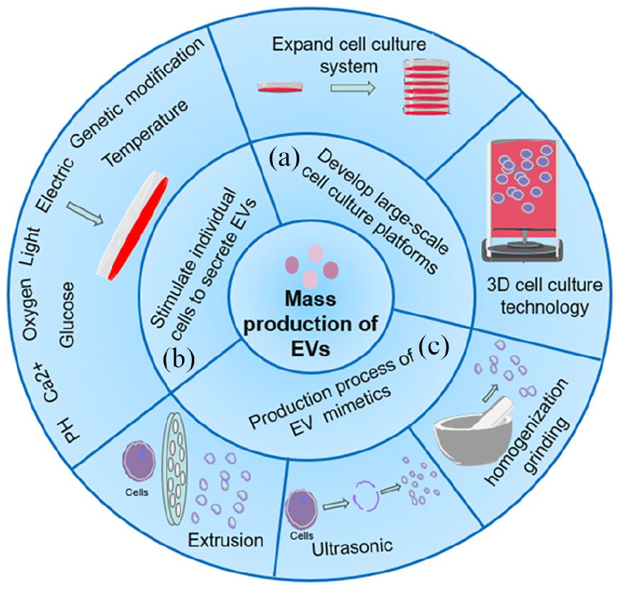 Mass production of EVs and EV mimetics: (a) expanding cell culture to collect more EVs, (b) adjusting pH, calcium ion concentration, glucose content, oxygen levels, and other culture conditions, as well as applying physical stimuli such as increased temperature, light exposure, or electric shock, can effectively enhance EV secretion, and (c) using physical forces (such as ultrasound, grinding, or extrusion) to disrupt the cell membrane, followed by the reformation of a large number of vesicles with structures similar to EVs.