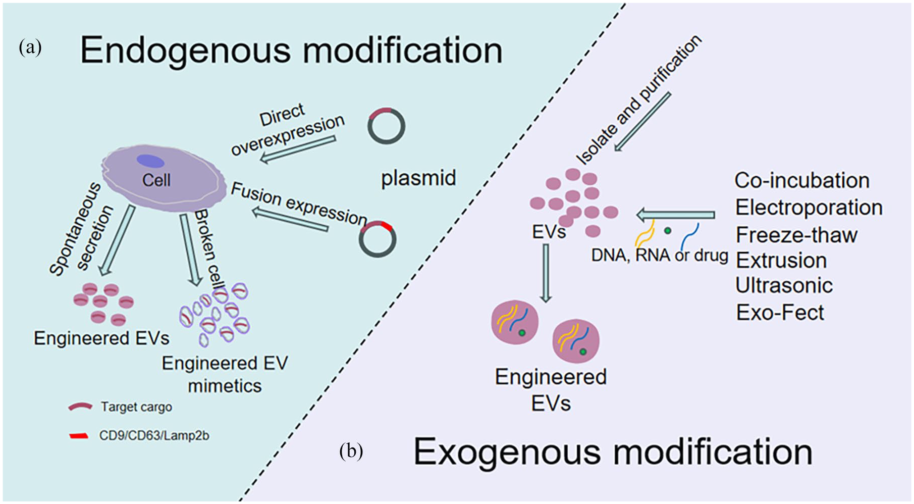 Two modification methods of engineered EVs: (a) genetically modifying the donor cells to achieve EV modification. This can be done by directly overexpressing or fusing the target protein with EV proteins (such as CD9, CD63, Lamp2b) to efficiently load the target protein into EVs. Another approach is to induce cell disruption after overexpression to generate EV mimetics that carry the target molecule and (b) after isolating EVs, exogenous cargo can be loaded into EVs using techniques such as electroporation, co-incubation, ultrasound, or transfection reagents.