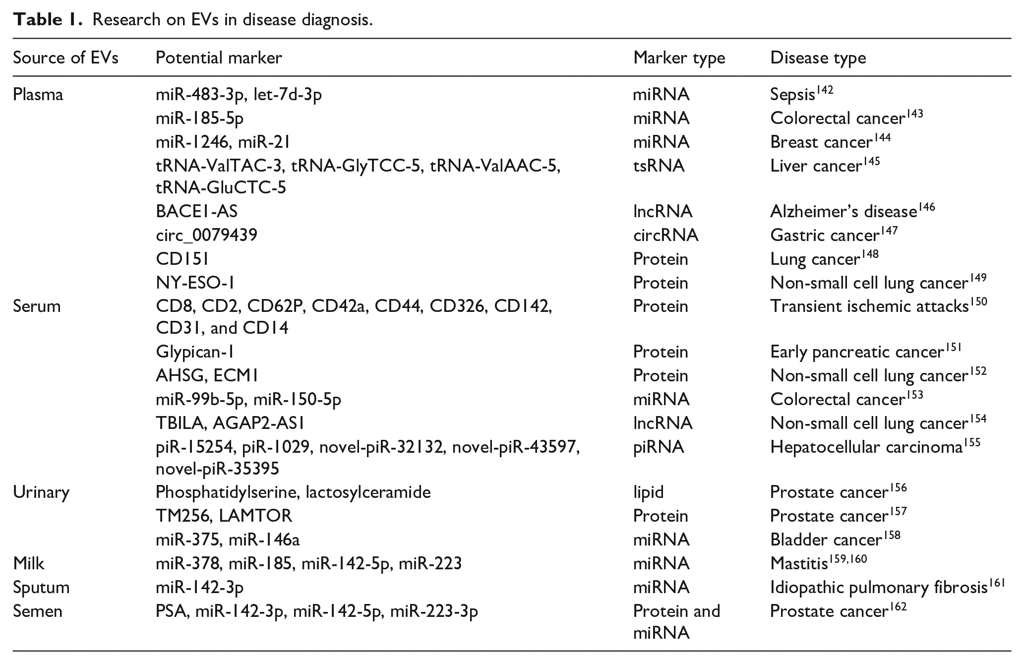Currently, circulating tumor DNA (ctDNA), circulating tumor cells (CTCs), and EVs represent the three main branches of liquid biopsy. CtDNA and CTCs have been approved for clinical use by the U.S. Food and Drug Administration (FDA). 140 Compared to ctDNA and CTCs, EVs exhibit greater advantages and unique characteristics in liquid biopsy. First, the abundance of EVs in biofluids makes them relatively easy to obtain. Second, EVs are secreted by living cells and carry a variety of biological information from their parental cells. Third, EVs are inherently stable due to their lipid bilayer structure, allowing them to circulate under physiological conditions, even within the harsh tumor microenvironment. This high biological stability also enables the long-term storage of specimens for EV isolation and detection. 141 We conducted a PubMed search using the keywords “Extracellular Vesicle” OR “exosome” and “Plasma” OR “Serum” OR “Urinary” OR “Milk” OR “Sputum” OR “Semen.” Several representative studies on the role of EVs in disease diagnosis were identified and are listed (Table 1).