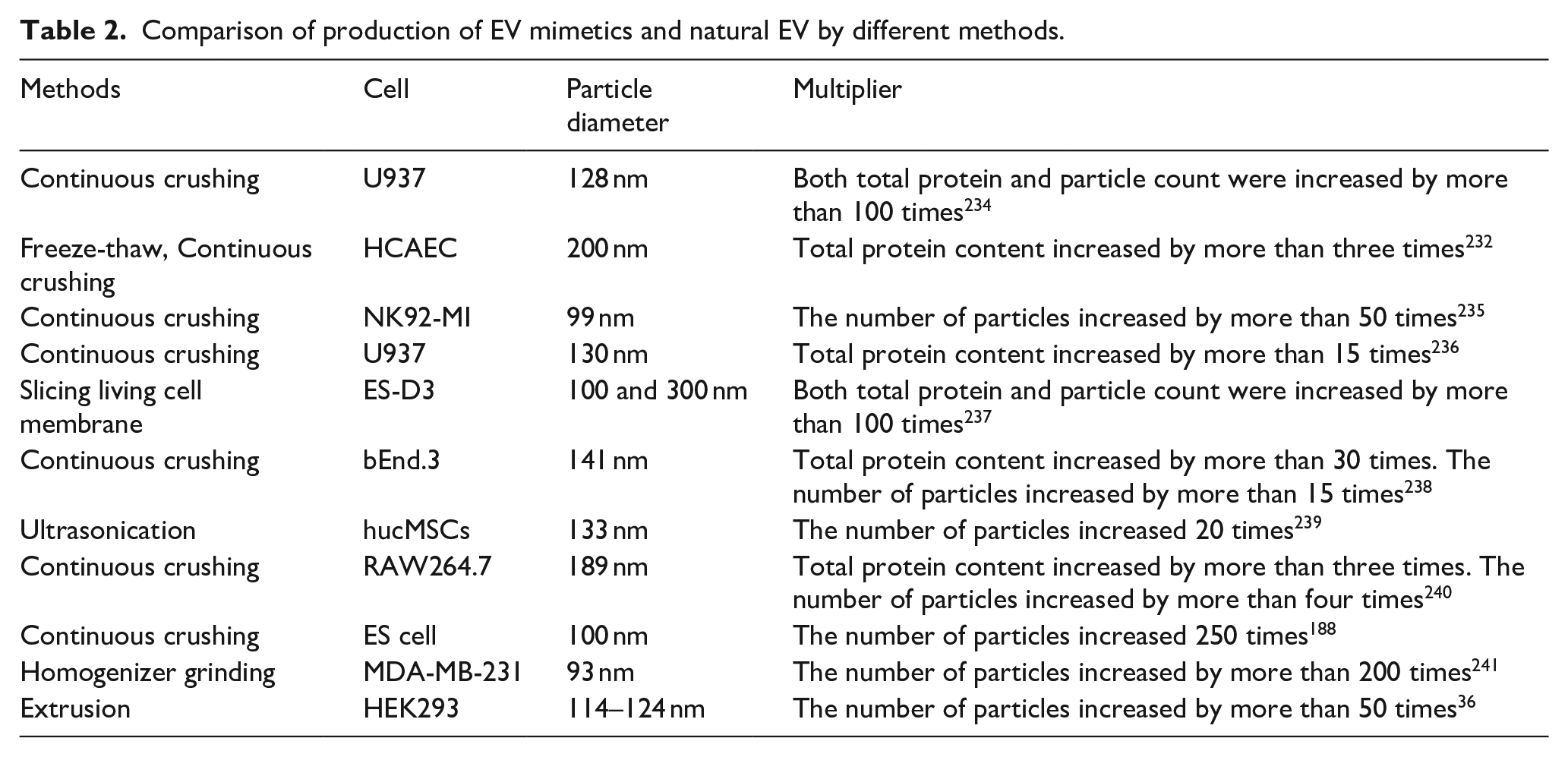 EVs by themselves or as vehicles for the delivery of drug payloads are being actively explored as therapeutic agents. Natural EVs from various sources perform diverse biological functions but exhibit batch effects and functional inconsistencies.242 –244 The core component of EVs is derived from the cell membrane. These methods utilize physical forces to disrupt the cell membrane, and the disrupted cell membrane then reforms into small vesicles containing proteins or drugs. Consequently, engineered EVs may offer improved consistency to ensure batch-to-batch reproducibility of their therapeutic efficacy, presenting greater potential for production and application. This physical method of producing EVs addresses two major limitations of natural EV production, including low yields and inconsistency in production. Loading specific proteins or nucleic acid drugs and while leveraging the rapid mass production of EV mimetics is another promising approach to complement natural EVs.