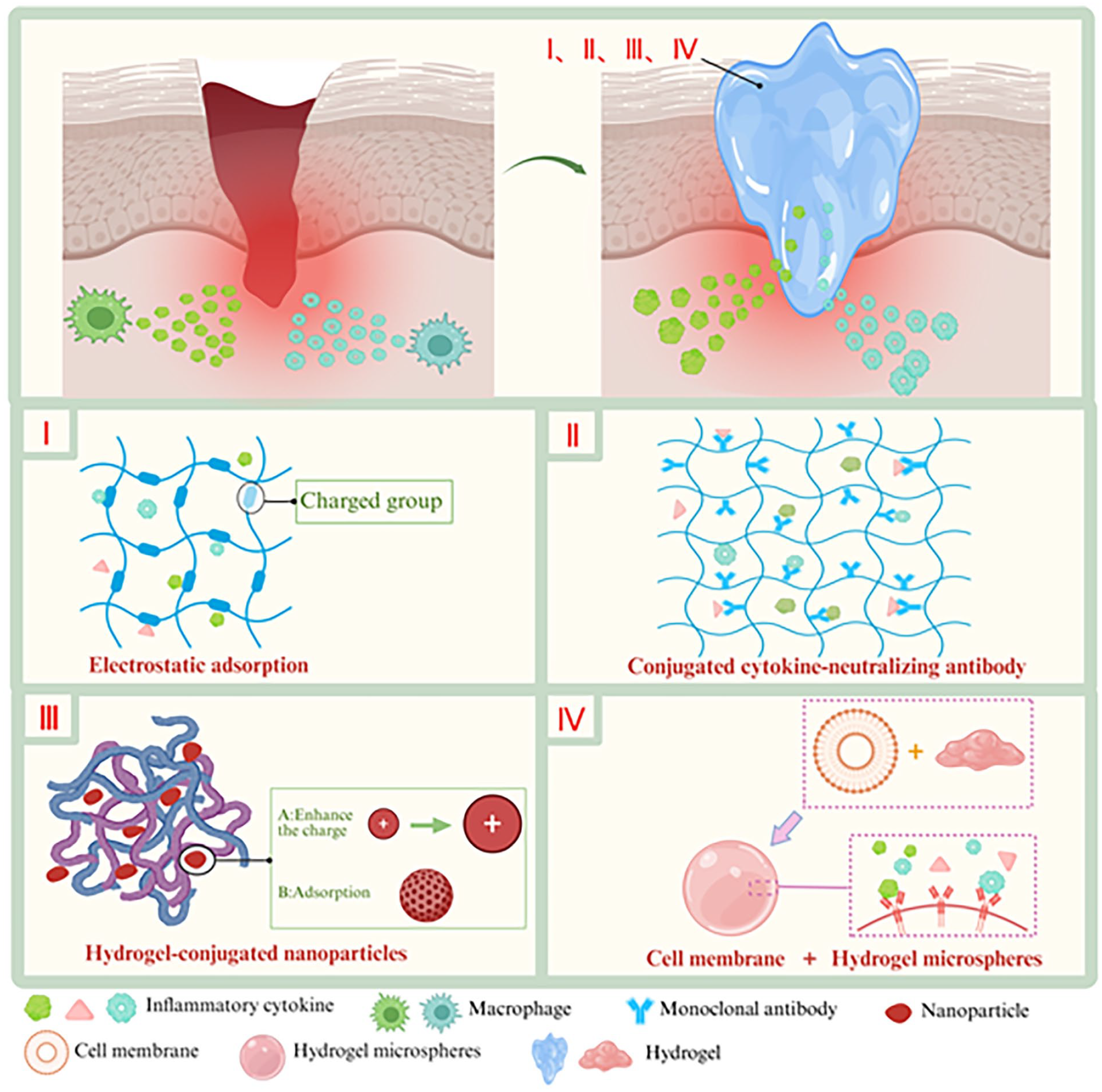 In view of the important role of inflammatory cytokines in diseases, the mechanisms by which hydrogels capture inflammatory cytokines are mainly divided into four types (Figure 1). First, hydrogels can capture and neutralize inflammatory cytokines through their physical properties. Most typical hydrogels contain glycosaminoglycan (GAG) ingredients, which utilize electrostatic interactions with inflammatory cytokines to capture inflammatory cytokines.31,32 Second, hydrogels can be conjugated with monoclonal antibodies to specifically capture and neutralize inflammatory cytokines, reducing the intensity of the inflammatory response, and improving the controllability, duration, and safety of biologics. 34 Third, the combination of hydrogels and cell membranes allows for broad-spectrum capture and storage of inflammatory cytokines. In addition, hydrogels can also participate in the regulation of inflammatory cytokines by binding to nanoparticles (NPs). 35 In summary, these strategies provide diverse approaches and potential clinical application prospects for the treatment of inflammation-related diseases.