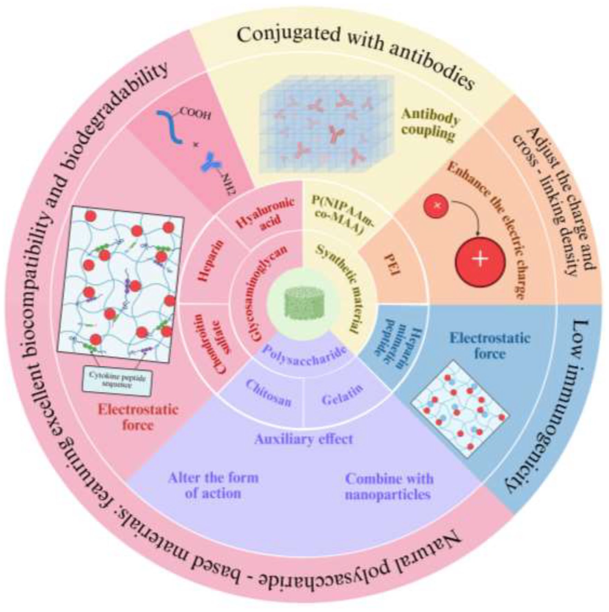 Generally speaking, among various strategies for capturing and neutralizing inflammatory cytokines, most of the materials used belong to polysaccharides. Whether natural raw materials or modified materials are used, it reflects to some extent that polysaccharides are excellent materials for capturing and neutralizing inflammatory cytokines.143,163 Although widely available in nature and characterized by good biocompatibility and biodegradability, polysaccharides also have notable drawbacks, such as susceptibility to contamination, complex purification processes, and challenges in large-scale production. Among synthetic materials, PEI, as a cationic polymer, can enhance the efficiency of hydrogels in capturing inflammatory cytokines by modulating charge intensity and crosslinking density. 32 The IL-6S, composed of P(NIPAAm-co-MAA) conjugated with IL-6 antibodies, has been shown to preserve antibody activity and exhibit no toxicity in mouse experiments. These findings demonstrate that synthetic materials also have unique advantages. 30 However, research on synthetic materials in this particular area remains limited.