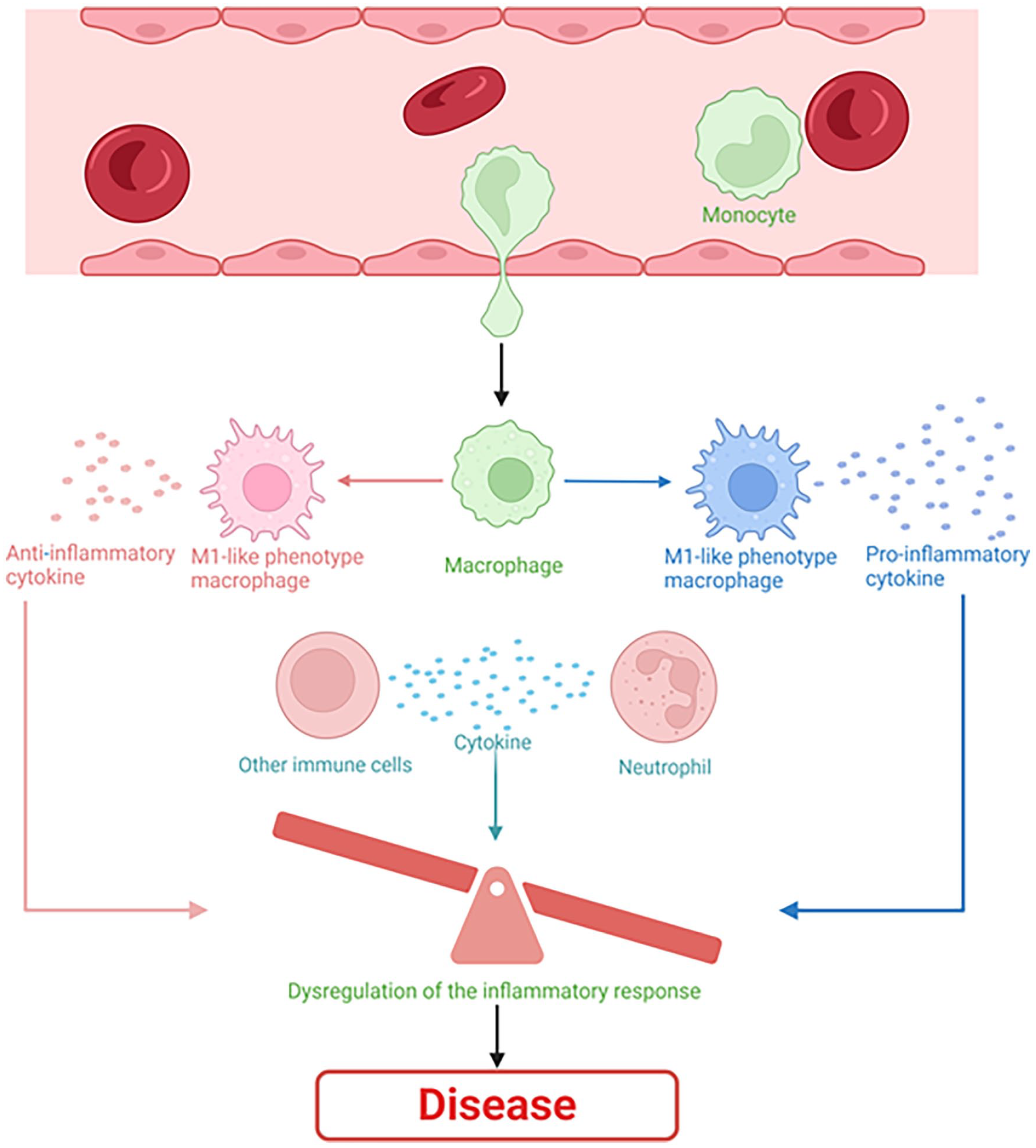 Inflammatory response and balance of inflammatory cytokines. Image was drawn using BioRender.