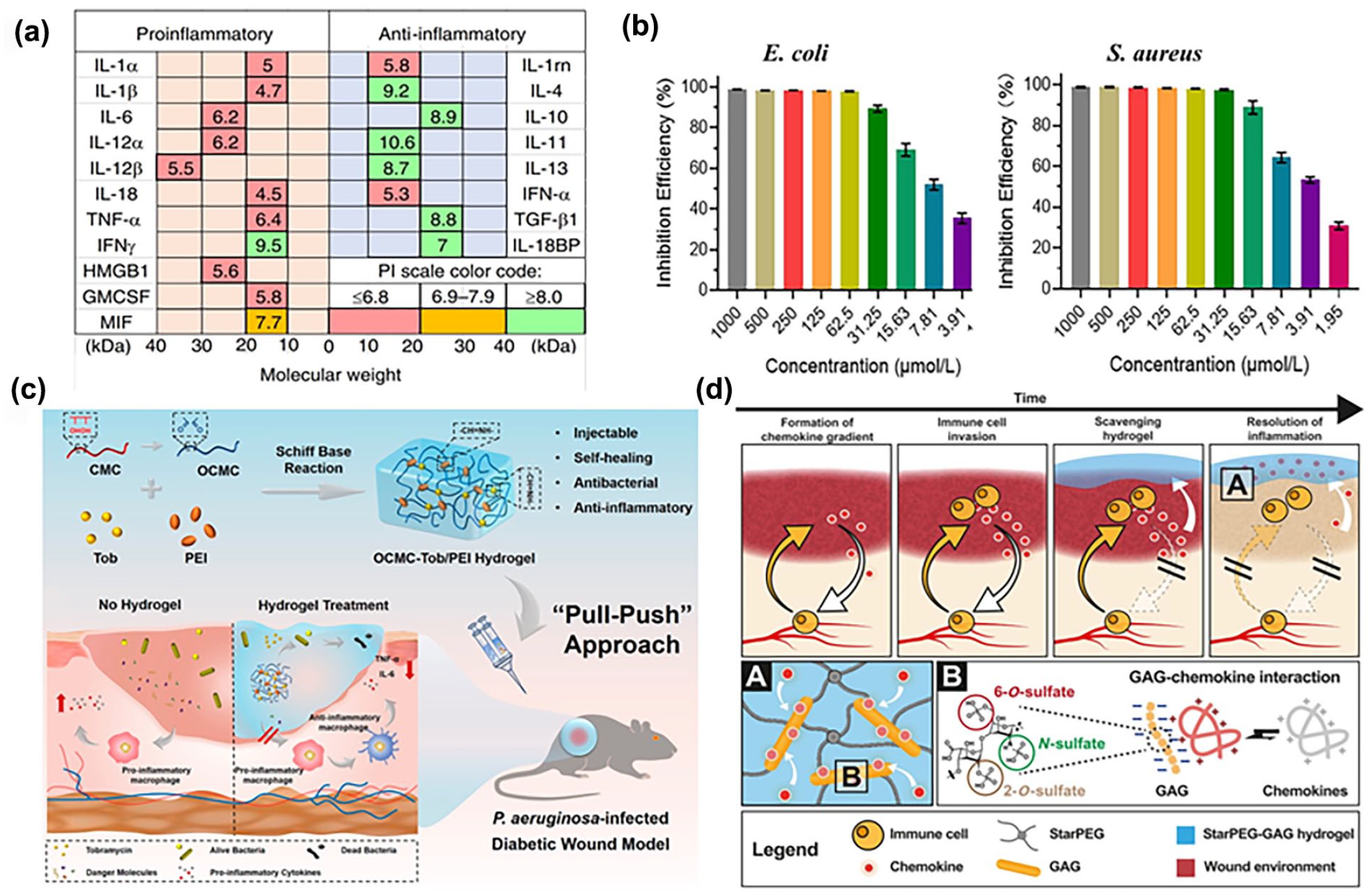 Charge characteristics of cytokines and physical adsorption mechanism of hydrogels. (a) Regarding the key cytokines in mice, their molecular weights and PIs have drawn attention. It turns out that there is a remarkable charge difference between proinflammatory cytokines, which typically carry a negative charge, and anti-inflammatory cytokines, which usually bear a positive charge. Reproduced with permission from Ref. 134 Copyright © 2020, The Author(s). (b) Tob’s efficiency in inhibiting E. coli and S. aureus. Reproduced with permission from Ref. 32 Copyright © 2022 Wiley-VCH GmbH. (c) The schematic illustration of the development of the bioactive hydrogel composed of OCMC, Tob and PEI for realizing the “Pull–Push” approach to heal bacteria-infected diabetic wounds efficiently and safely. Reproduced with permission from Ref. 138 Copyright © 2022 American Chemical Society. (d) The schematic representation of the suggested functionality of starPEG-GAG hydrogels for regulating chemokine gradients in chronic wounds over the course of time. Reproduced with permission from Ref. 31 Copyright © 2017, The American Association for the Advancement of Science.
