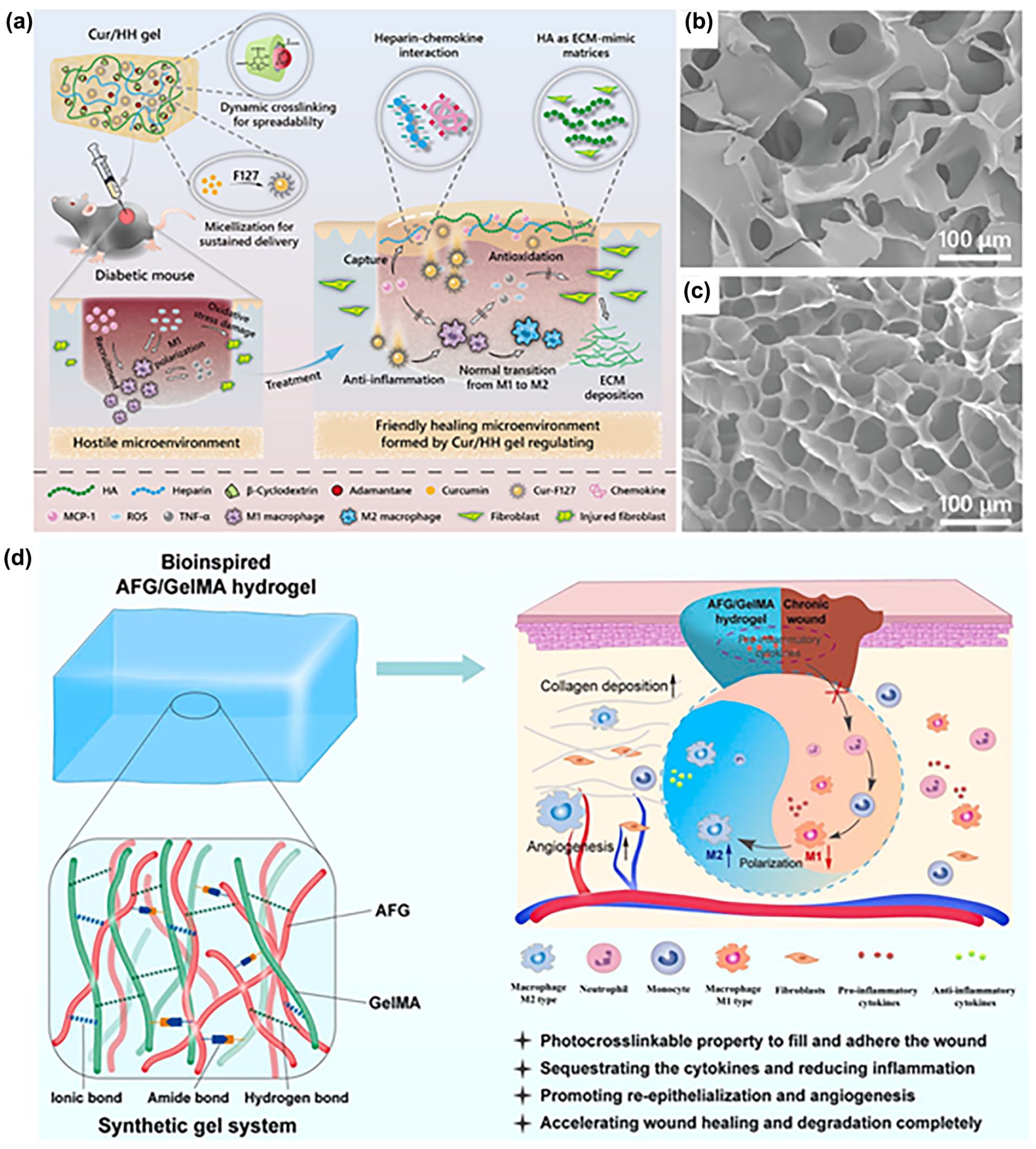 Applications of GAG-based hydrogels in wounds. (a) Schematic representation depicting the multifunctional Cur/HH gel and its progressive therapeutic impact on diabetic chronic wounds. (b and c) SEM images of HH gel and Cur/HH gel are presented in (b and c) respectively. (a–c) Reproduced with permission from Ref. 143 Copyright © 2022 American Chemical Society. (d) The bioinspired hydrogel was fabricated by covalently linking polyanionic AFG and positively charged GelMA polymers, and its activity and mechanism in chronic wound healing were also investigated. Reproduced with permission from Ref. 148 Copyright © 2023 Elsevier Ltd.