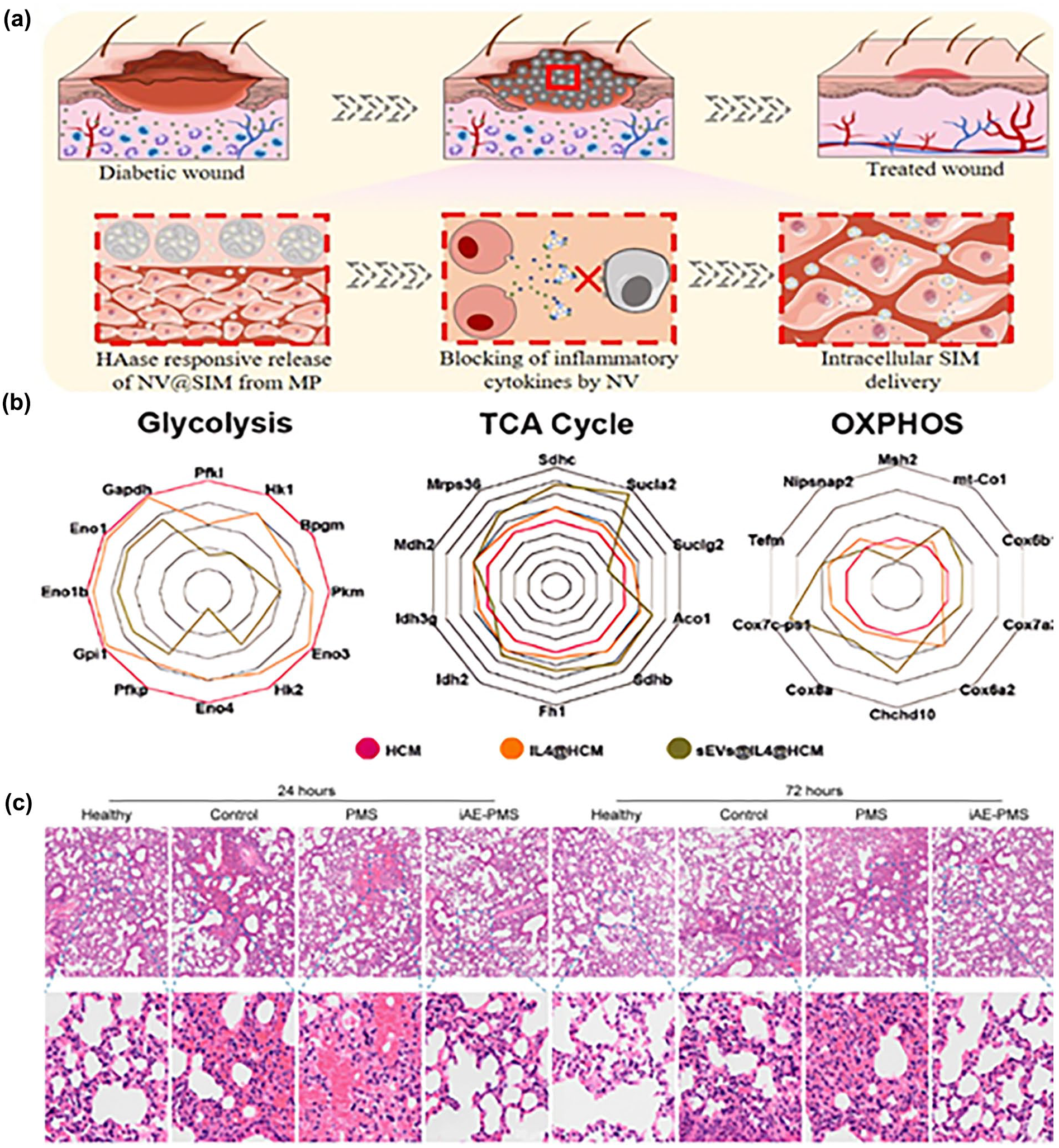 The application of the combination of hydrogel microspheres and cell membranes. (a) When the NV@SIM-MPs with HAase responsiveness are applied to diabetic wounds, they can release NVs@SIM in a responsive manner, thereby neutralizing inflammatory cytokines and alleviating the inflammatory response. Reproduced with permission from Ref. 33 Copyright © 2022 Elsevier B.V. (b) The changes of gene expression levels in the processes of glycolysis, tricarboxylic acid cycle and oxidative phosphorylation. Reproduced with permission from Ref. 157 Copyright © 2023 The Authors. (c) The lung tissues of healthy, control, PMS, and iAE-PMS groups were subjected to histopathological analysis at 24 and 72 h after ALI induction. Scale bar: 100 μm. Reproduced with permission from Ref. 158 Copyright © 2021 Elsevier Inc.