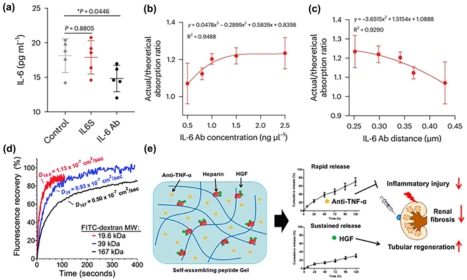 Advantages of antibody-conjugated hydrogels for neutralizing inflammatory cytokines. (a) Healthy mice were given IL-6S or the same amount of IL-6 antibody for treatment (intravenously, 100 ng). Twenty-four hours later, the concentration of serum IL-6 was measured (