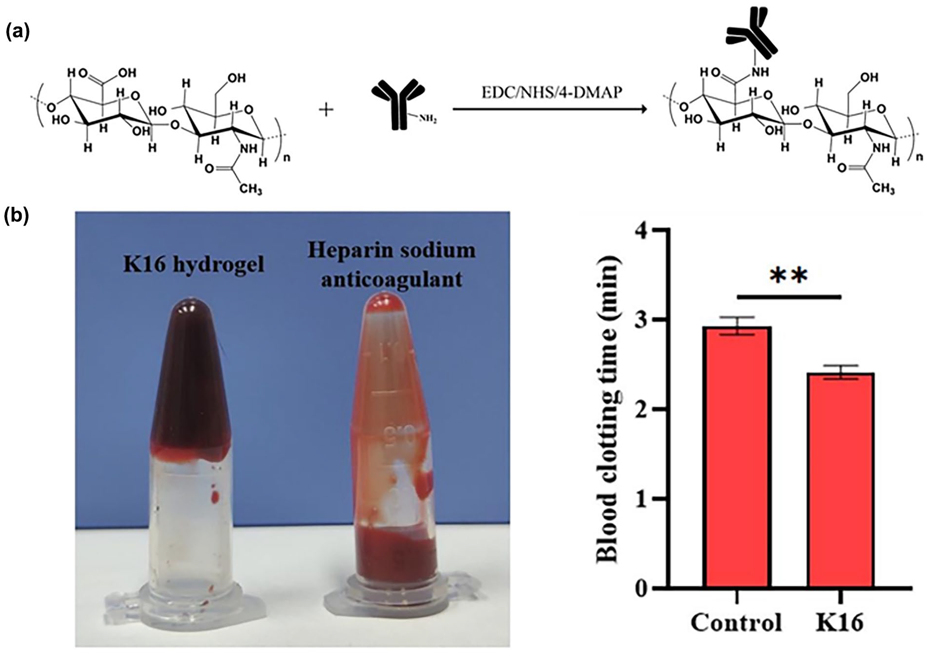 The schematic diagram of the conjugation between antibody and hydrogel, and the Hep-mimicking peptides do not possess anticoagulant effects. (a) The use of N-(3-dimethylaminopropyl)-N′-ethylcarbodiimide hydrochloride (EDC), N-hydroxysulfosuccinimide sodium salt (sulfo-NHS), and 4-(dimethylamino) pyridine (4-DMAP) enabled the activation of HA, facilitating the formation of an amide bond with the amine group present on the antibody. Reproduced with permission from Ref. 160 Copyright © 2013 Society of Plastics Engineers. (b) Three minutes after the blood was collected, the blood in the test tube containing sodium Hep anticoagulant was still flowing normally, while the blood in the K16 hydrogel group had already clotted, indicating that the K16 hydrogel does not have the Hep-like anticoagulant effect. Reproduced with permission from Ref. 149 Copyright © 2023 Wiley-VCH GmbH.