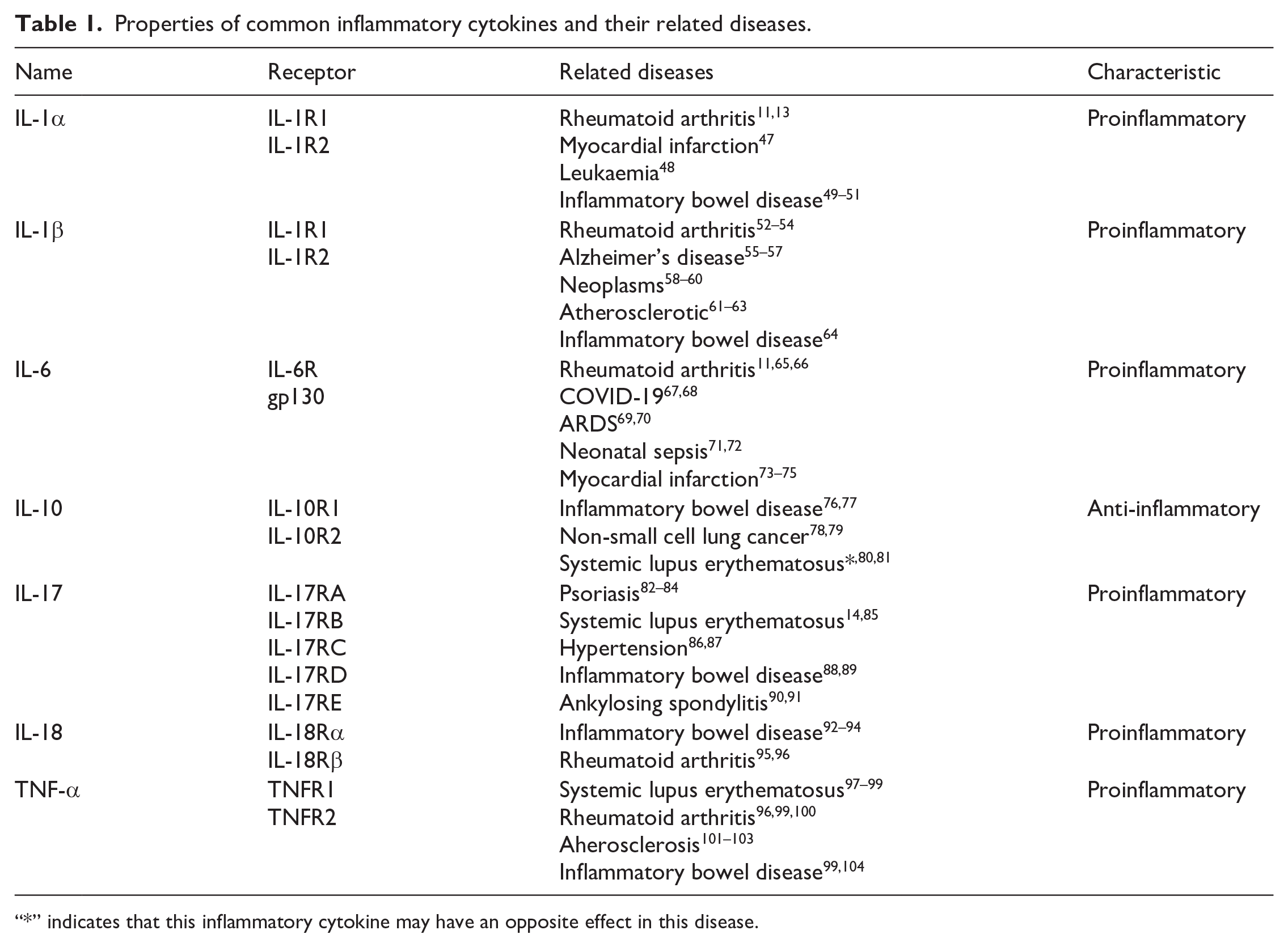 Properties of common inflammatory cytokines and their related diseases.