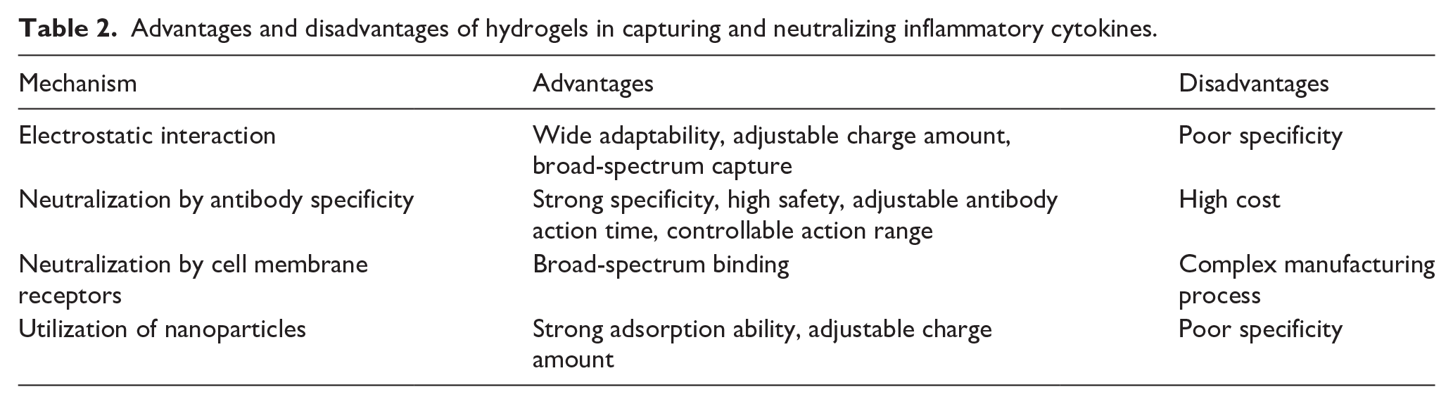Advantages and disadvantages of hydrogels in capturing and neutralizing inflammatory cytokines.