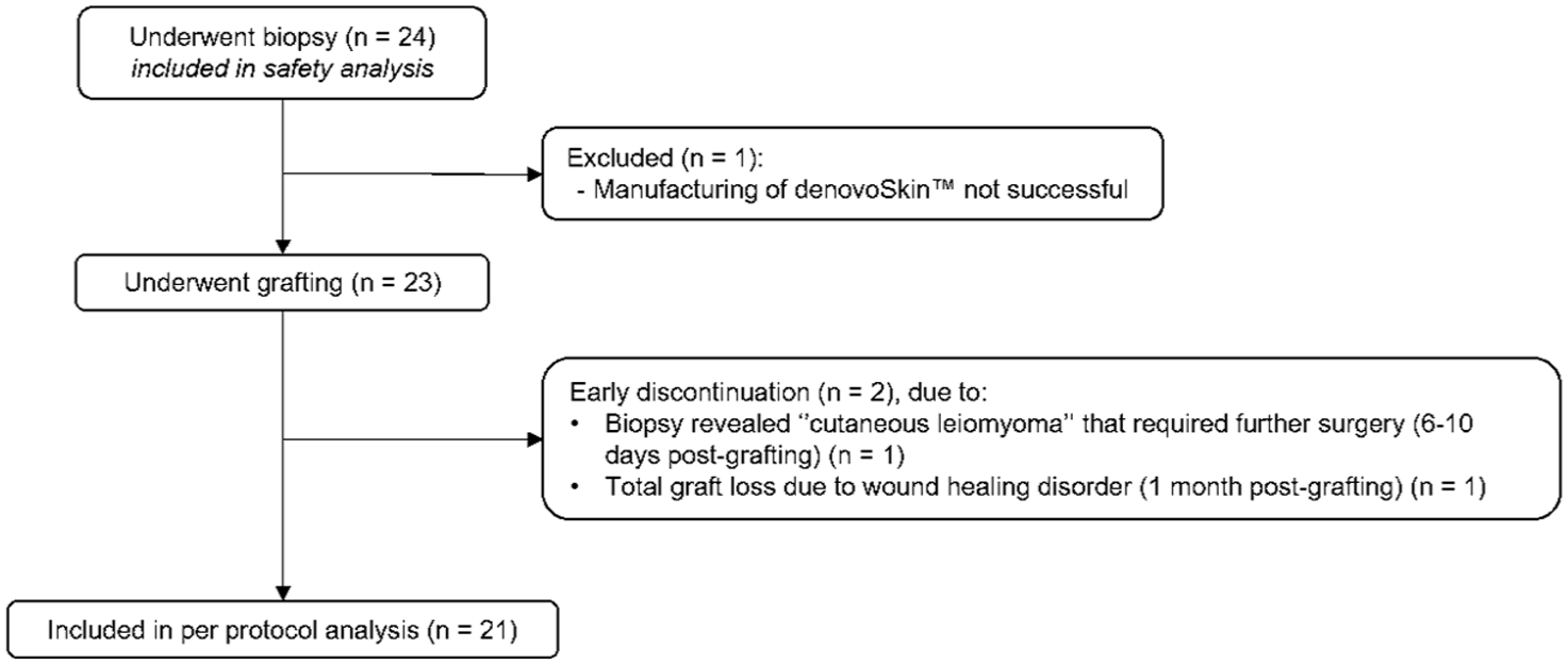 A split-thickness skin biopsy of approximately 4 cm2 was harvested from the patient requiring coverage of a full thickness defect, with an electric dermatome set at 0.2 mm. Autologous keratinocytes and fibroblasts were isolated and expanded in vitro. Subsequently, fibroblasts were incorporated into a bovine type I collagen hydrogel (Symatese, Chaponost, France), compressed and after a culture phase, keratinocytes were seeded on top to create the bi-layered dermo-epidermal skin graft denovoSkin™ . 21 The development and preclinical data on this construct were published earlier.11,12,14,22 After a production time of approximately 30 days, one or two pieces of denovoSkin™ (size 45 ± 4 cm2, thickness 0.5–2.0 mm) were shipped to the study sites in temperature-controlled conditions under Good Distribution Practice. Until February 2020, denovoSkin™ was manufactured in the GMP-certified clean room facility of Wyss Zurich, Zurich, Switzerland, and thereafter in the GMP-certified clean room facility of CUTISS AG, Schlieren, Switzerland. The production process is operating under GMP regulations involving in process controls, process validations and product release specifications. These include: graft’s integrity, geometry & thickness, cell count in graft, cells viability, histology and sterility.