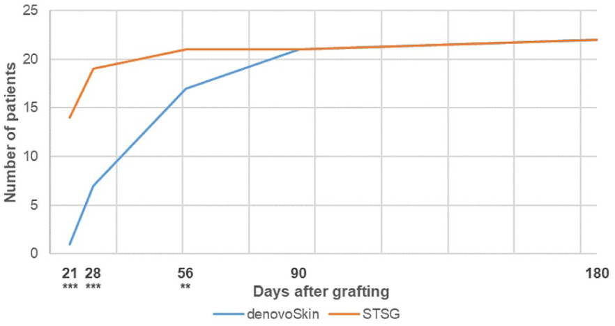 Number of patients with complete wound closure (⩾95% epithelialization) over time for denovoSkin™ (