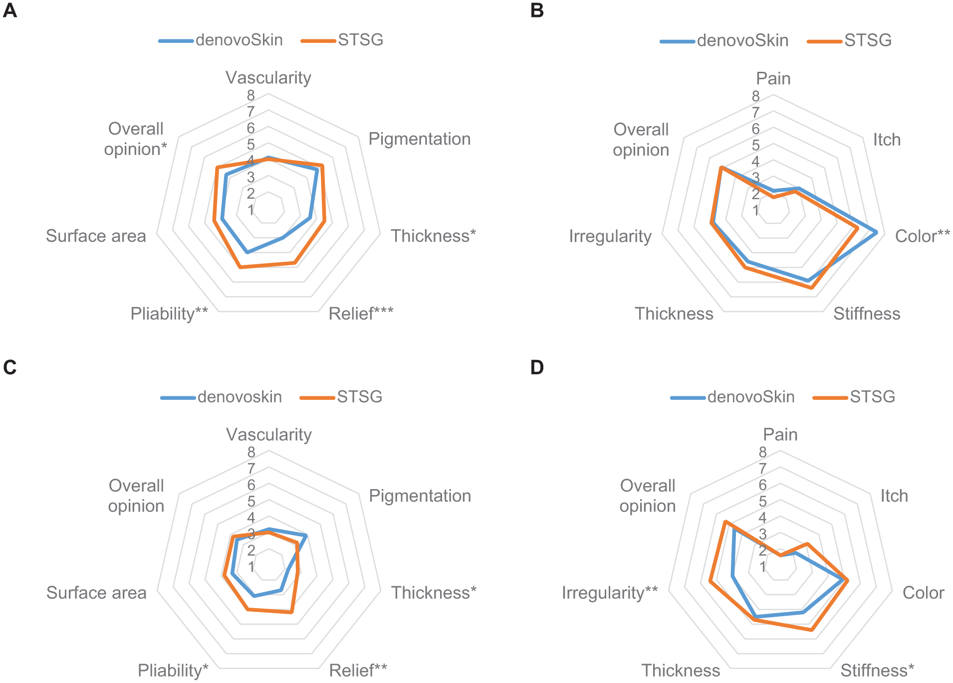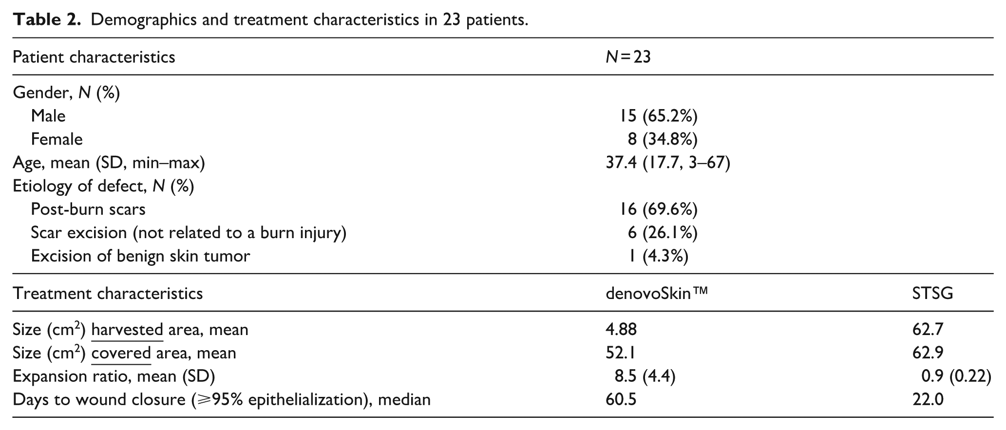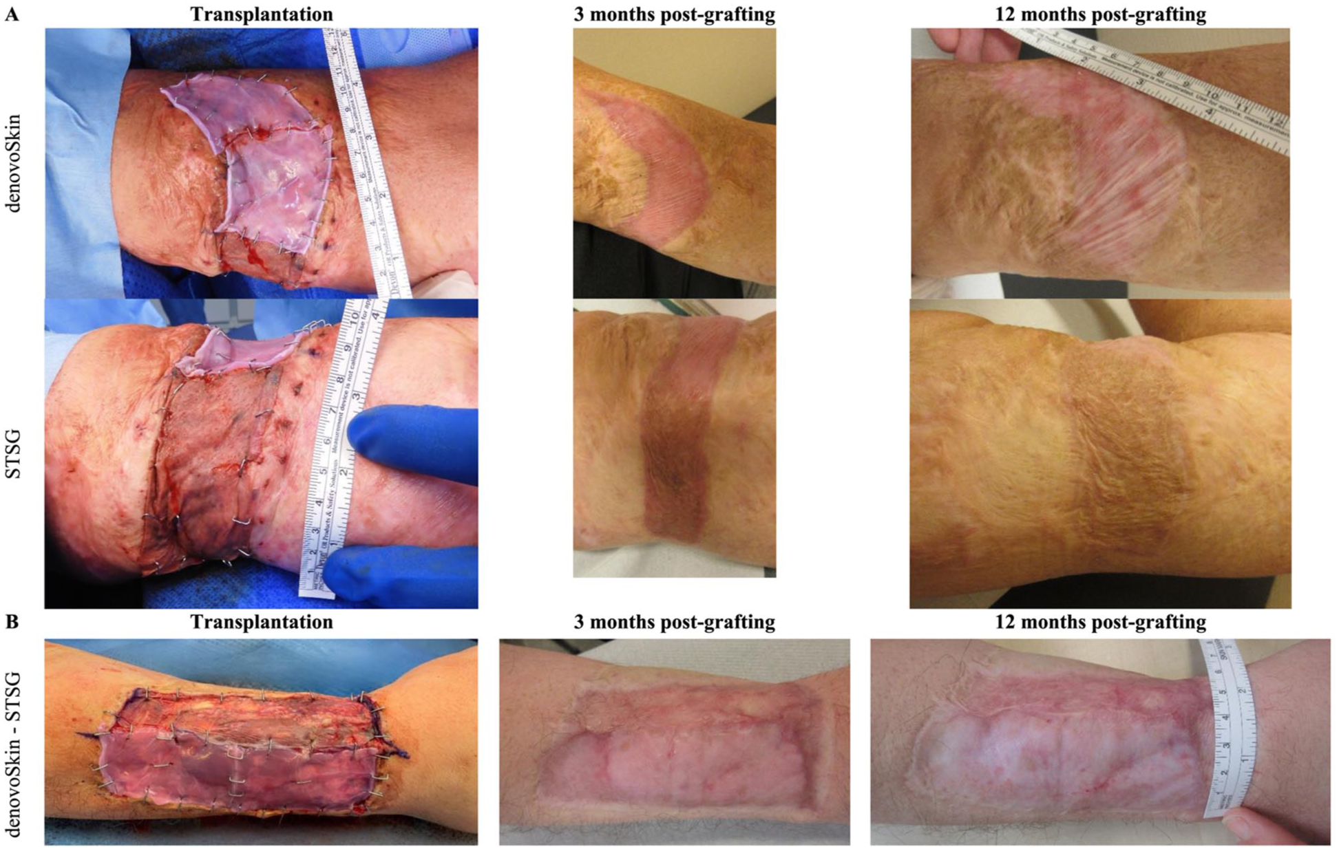 Finally, one may question whether comparing denovoSkin™ to STSG represents the most appropriate comparison. FTSGs may more closely resemble the structure of denovoSkin™, however, the clinical applicability of FTSGs is limited due to high donor site constraints, especially in patients with large skin defects. Although the defects treated in this clinical trial were relatively modest in size, future use of denovoSkin™ in reconstruction would allow coverage of much larger defects. Also, STSGs remain commonly used, especially in burn reconstructive settings, where there is a limitation in donor sites for other reconstructive techniques, making these a relevant comparator in this trial.
