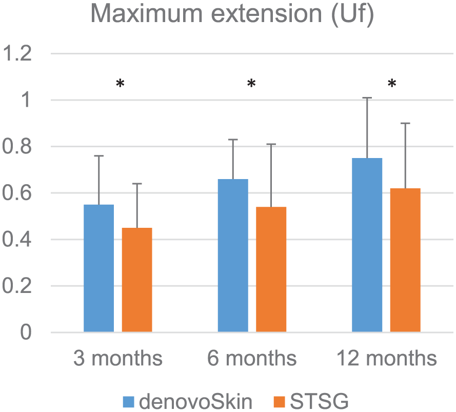 Mean cutometer values (maximum extension (Uf)) in 20 patients for denovoSkin™ (blue) and STSG (orange) versus the values for the respective normal skin at 3, 6, and 12 months post-grafting.