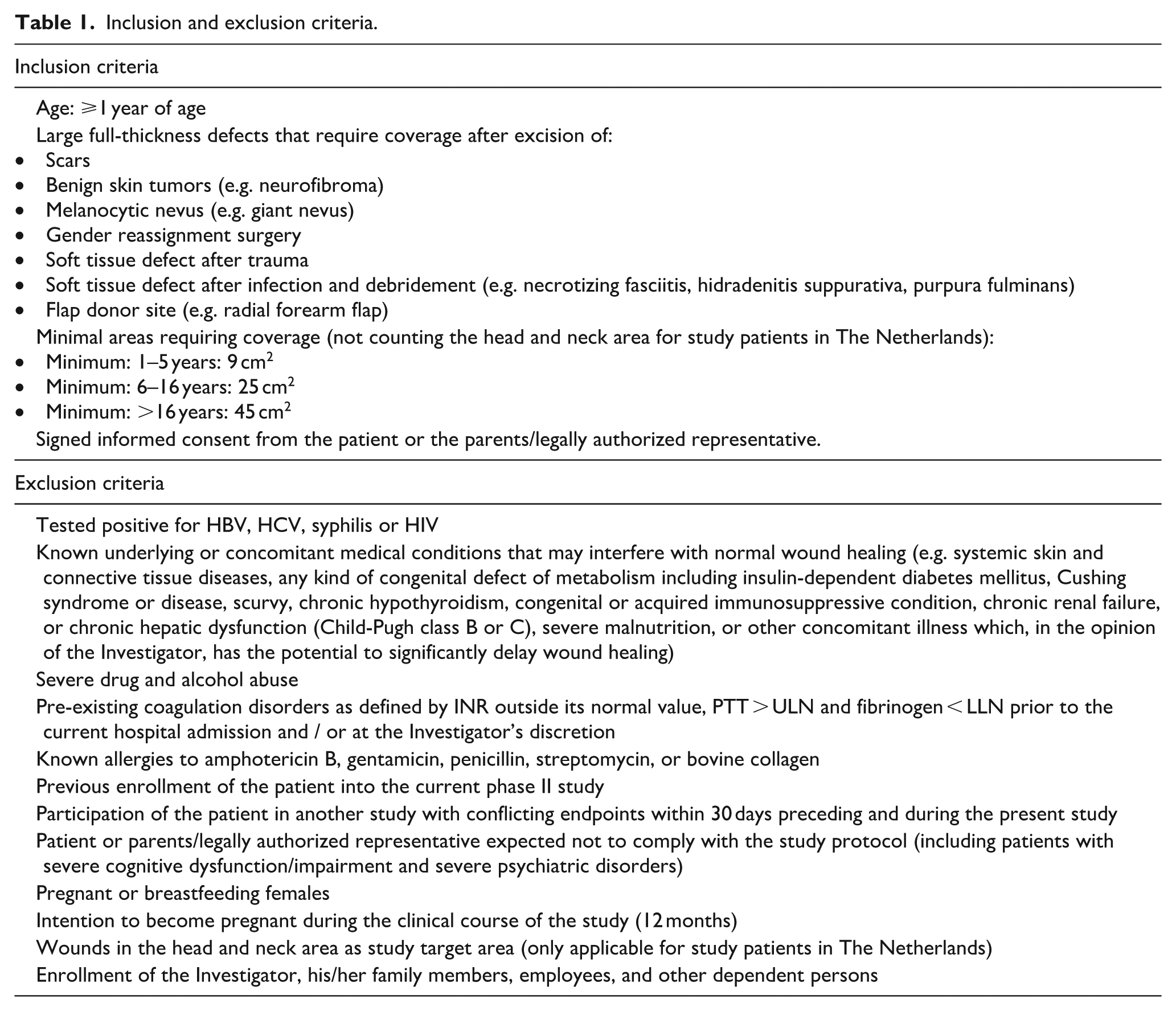 Eligible participants were patients (⩾1 years old) with full-thickness defects that required coverage in planned elective procedures. Inclusion and exclusion criteria are summarized in Table 1. The minimum wound area required was stratified by age category as follows: 9 (1–5 years), 25 (6–16 years), and 45 cm2 (>16 years). A sample size of 20 patients was calculated to provide 80% power to detect a statistically significant difference at a 5% significance level. Considering possible dropouts prior to assessment of the primary endpoint, this number was increased to 25.