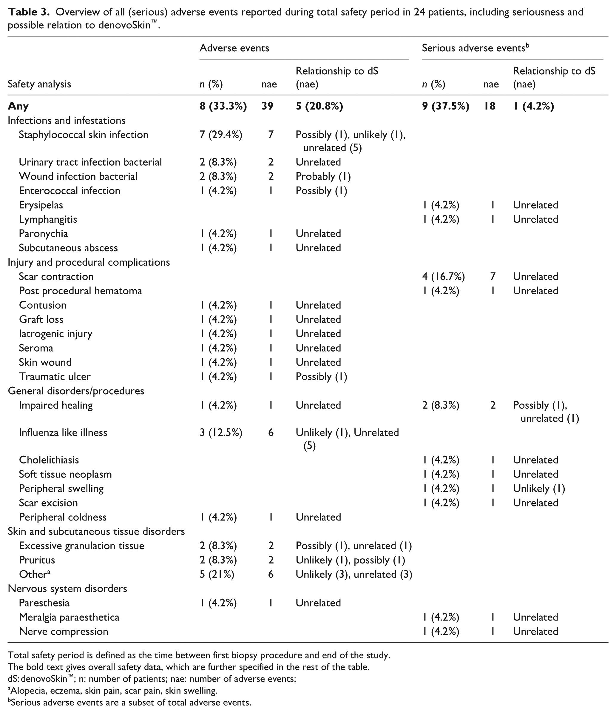 A safety evaluation was performed on data of 24 patients that underwent biopsy. An overview of (serious) adverse events that occurred during the study period is presented in Table 3. Over the total safety period, defined as the time between biopsy and end of the study (12 months post transplantation), a total of 57 events were reported for 17 patients, of which 18 events in 9 patients were serious. The most frequently reported adverse events were staphylococcal skin infections (29%) and scar contraction (17%). Infections in study areas occurred in six patients, two of these were in denovoSkin™ treated areas only (